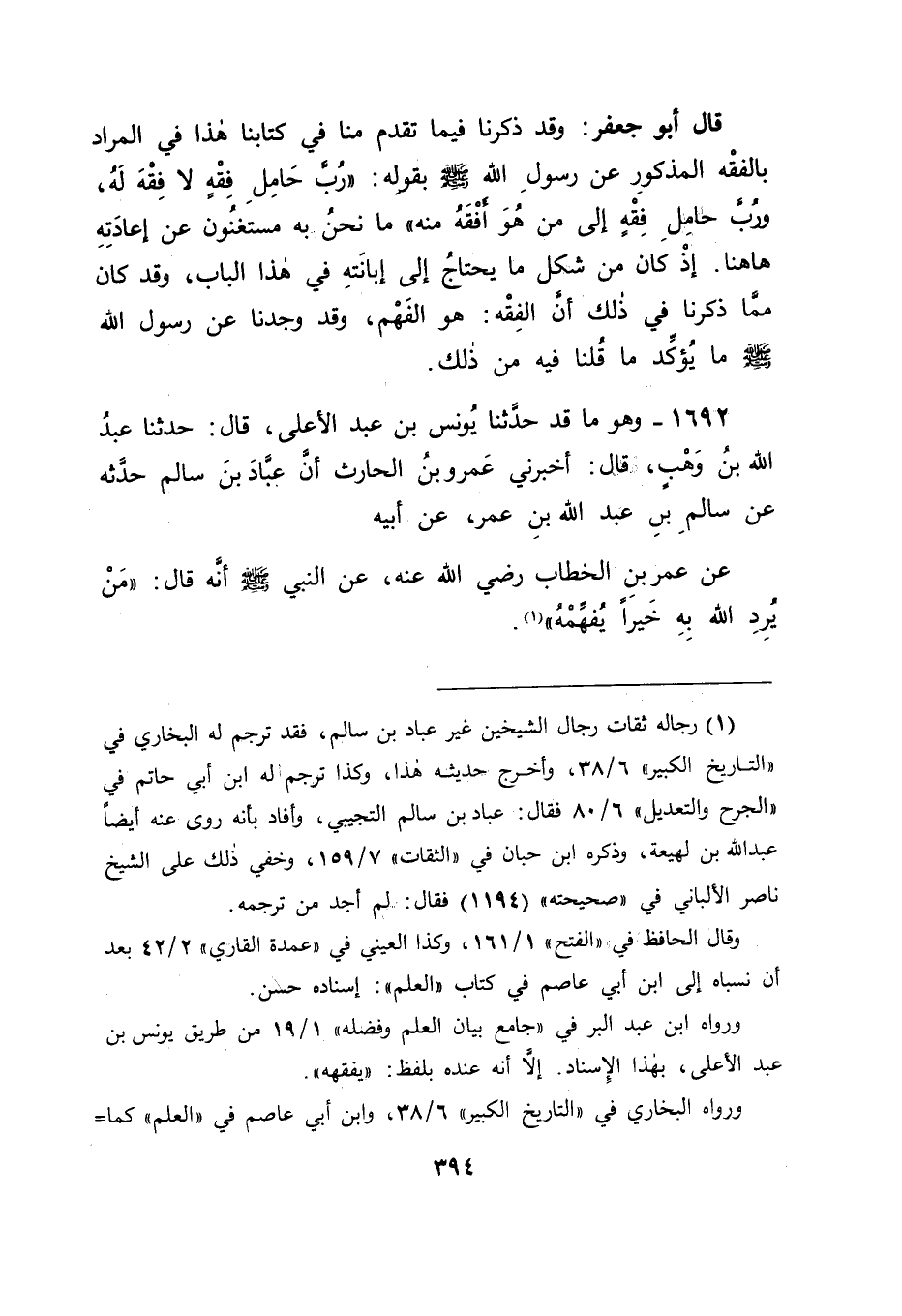 1692 - وَهُوَ مَا قَدْ حَدَّثَنَا يُونُسُ بْنُ عَبْدِ الْأَعْلَى , قَالَ: حَدَّثَنَا عَبْدُ اللهِ بْنُ وَهْبٍ , قَالَ: أَخْبَرَنِي عَمْرُو بْنُ الْحَارِثِ , أَنَّ عَبَّادَ بْنَ سَالِمٍ , حَدَّثَهُ عَنْ سَالِمِ بْنِ عَبْدِ اللهِ بْنِ عُمَرَ , عَنْ أَبِيهِ , عَنْ عُمَرَ بْنِ الْخَطَّابِ , رَضِيَ اللهُ عَنْهُ عَنِ النَّبِيِّ صَلَّى اللَّهُ عَلَيْهِ وَسَلَّمَ أَنَّهُ قَالَ: " مَنْ يُرِدِ اللهُ بِهِ خَيْرًا يُفَهِّمْهُ " -[395]- قَالَ أَبُو جَعْفَرٍ: فَعَقَلْنَا بِذَلِكَ أَنَّ مَعْنَى " يُفَقِّهْهُ " عَلَى مَعْنَى مَا قَدْ رَوَيْنَاهُ فِي هَذَا الْبَابِ أَنَّهُ يُفَهِّمُهُ غَيْرَ أَنَّا قَدْ ذَكَرْنَا فِي الْبَابِ الَّذِي ذَكَرْنَا فِيهِ عَنْ رَسُولِ اللهِ صَلَّى اللَّهُ عَلَيْهِ وَسَلَّمَ قَوْلَهُ " رُبَّ حَامِلِ فِقْهٍ لَا فِقْهَ لَهُ، وَرُبَّ حَامِلِ فِقْهٍ إلَى مَنْ هُوَ أَفْقَهُ مِنْهُ " فِيمَا قَدْ تَقَدَّمَ مِنَّا فِي كِتَابِنَا هَذَا أَنَّهُ لَيْسَ كُلُّ مَفْهُومٍ بِمَعْنَى كُلِّ مَا فُقِهَ وَأَنَّ لِمَا فُقِهَ مِنْ أَمْرِ الدِّينِ دَرَجَةً زَائِدَةً عَلَى كُلِّ مَفْهُومٍ سِوَاهُ عَلَى مَا قَدْ ذَكَرْنَا هُنَاكَ، وَاللهَ نَسْأَلُهُ التَّوْفِيقَ