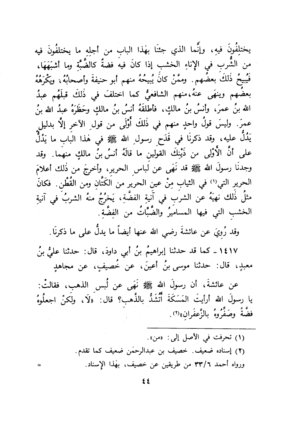1417 - كَمَا قَدْ حَدَّثَنَا إبْرَاهِيمُ بْنُ أَبِي دَاوُدَ , قَالَ: حَدَّثَنَا عَلِيُّ بْنُ مَعْبَدٍ , قَالَ: حَدَّثَنَا مُوسَى بْنُ أَعْيَنَ , عَنْ خُصَيْفٍ , عَنْ مُجَاهِدٍ , عَنْ عَائِشَةَ , أَنَّ رَسُولَ اللهِ صَلَّى اللَّهُ عَلَيْهِ وَسَلَّمَ " نَهَى عَنْ لُبْسِ الذَّهَبِ " فَقَالَتْ: يَا رَسُولَ اللهِ أَرَأَيْتَ الْمَسَكَةَ أَتُشَدُّ بِالذَّهَبِ قَالَ: " لَا , وَلَكِنِ اجْعَلُوهُ فِضَّةً وَصَفِّرُوهُ بِالزَّعْفَرَانِ " -[45]- فَفِي هَذَا مَا قَدْ دَلَّ عَلَى إبَاحَتِهِ صَلَّى اللَّهُ عَلَيْهِ وَسَلَّمَ اسْتِعْمَالَ الْفِضَّةِ مِسْكًا وَلَمْ يَمْنَعْ مِنْ ذَلِكَ كَمَا مَنَعَ مِنَ اسْتِعْمَالِهَا خَالِصَةً مَلْبُوسَةً كَمَا يُلْبَسُ مَا يُجْعَلُ مِسْكًا لَهَا وَقَدْ رُوِيَ عَنْ حُذَيْفَةَ بْنِ الْيَمَانِ وَالْبَرَاءِ بْنِ عَازِبٍ عَنْ رَسُولِ اللهِ صَلَّى اللَّهُ عَلَيْهِ وَسَلَّمَ فِيمَا كَانَ نَهَى عَنْهُ مِنَ الْفِضَّةِ وَذَكَرَ حُذَيْفَةُ فِي حَدِيثِهِ الذَّهَبَ