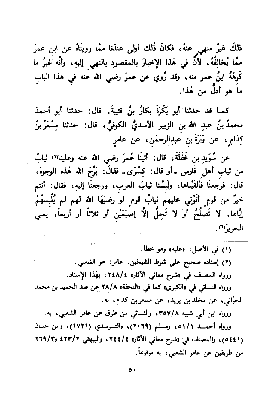 كَمَا قَدْ حَدَّثَنَا أَبُو بَكْرَةَ بَكَّارُ بْنُ قُتَيْبَةَ قَالَ: حَدَّثَنَا أَبُو أَحْمَدَ مُحَمَّدُ بْنُ عَبْدِ اللهِ بْنِ الزُّبَيْرِ الْأَسَدِيُّ الْكُوفِيُّ قَالَ: حَدَّثَنَا مِسْعَرُ بْنُ كِدَامٍ، عَنْ وَبَرَةَ بْنِ عَبْدِ الرَّحْمَنِ عَنْ عَامِرٍ عَنْ سُوَيْدِ بْنِ غَفَلَةَ قَالَ: أَتَيْنَا عُمَرَ رَضِيَ اللهُ عَنْهُ وَعَلَيْنَا ثِيَابٌ مِنْ ثِيَابِ أَهْلِ فَارِسَ أَوْ قَالَ: كِسْرَى فَقَالَ: " بَرَّحَ اللهُ هَذِهِ الْوُجُوهَ " قَالَ: فَرَجَعْنَا فَأَلْقَيْنَاهَا وَلَبِسْنَا ثِيَابَ الْعَرَبِ وَرَجَعْنَا إلَيْهِ فَقَالَ: " أَنْتُمْ خَيْرٌ مِنْ قَوْمٍ أَتَوْنِي عَلَيْهِمْ ثِيَابُ قَوْمٍ لَوْ رَضِيَهَا اللهُ لَهُمْ لَمْ يُلْبِسْهُمْ إيَّاهَا , لَا تَصْلُحُ أَوْ لَا تَحِلُّ إلَّا إِصْبُعَيْنِ أَوْ ثَلَاثًا أَوْ أَرْبَعًا يَعْنِي الْحَرِيرَ " -[51]- قَالَ: أَبُو جَعْفَرٍ: فَهَذَا عُمَرُ يَقُولُ هَذَا , وَفِي ذَلِكَ مَا قَدْ دَلَّ عَلَى أَنَّ مِثْلَ الْحَرِيرِ فِي ذَلِكَ الْفِضَّةُ الَّتِي قَدْ نَهَى عَنْهَا أَنْ يُشْرَبَ فِيهَا إذَا كَانَتْ آنِيَةً , لَا يَدْخُلُ فِي ذَلِكَ الشُّرْبُ فِيمَا هُوَ مِنَ الْخَشَبِ مِنَ الْآنِيَةِ الَّتِي قَدْ خَالَطَتْهَا الْفِضَّةُ مِنْ تَسْمِيرِهَا وَمِنْ تَضْبِيبِهَا بِهَا