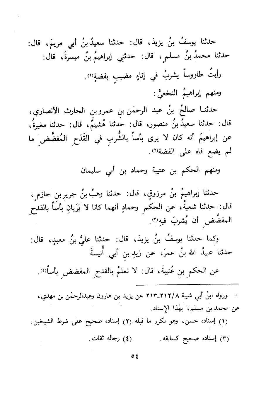 حَدَّثَنَا يُوسُفُ بْنُ يَزِيدَ قَالَ: حَدَّثَنَا سَعِيدُ بْنُ أَبِي مَرْيَمَ قَالَ: حَدَّثَنَا مُحَمَّدُ بْنُ مُسْلِمٍ قَالَ: حَدَّثَنِي إبْرَاهِيمُ بْنُ مَيْسَرَةَ قَالَ: رَأَيْتُ طَاوُسًا يَشْرَبُ فِي إنَاءٍ مُضَبَّبٍ بِفِضَّةٍ "
