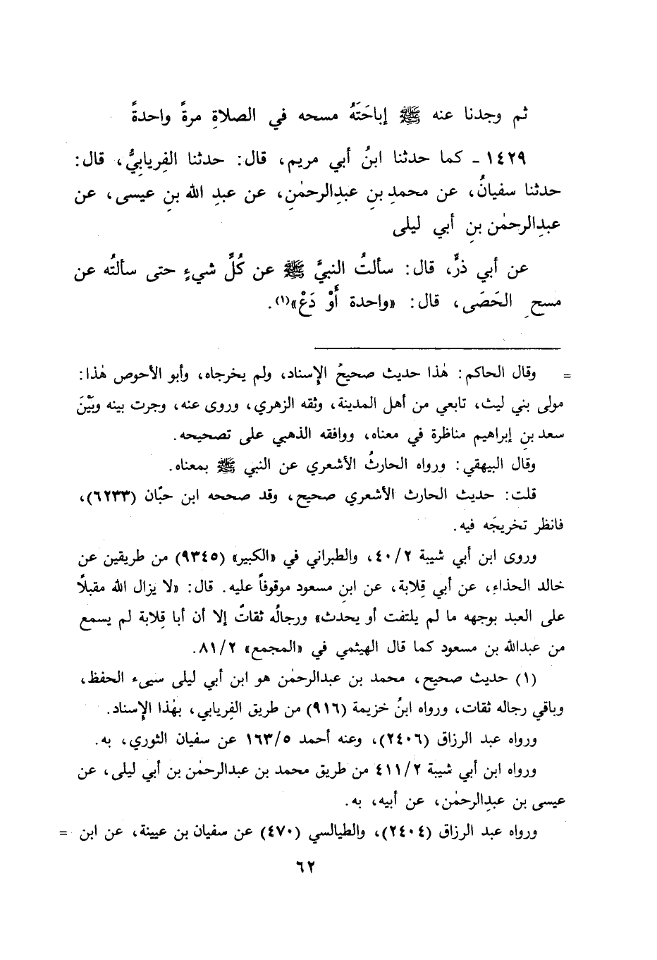 ثُمَّ وَجَدْنَا عَنْهُ صَلَّى اللَّهُ عَلَيْهِ وَسَلَّمَ إبَاحَتَهُ مَسْحَهُ فِي الصَّلَاةِ مَرَّةً وَاحِدَةً 1429 - كَمَا حَدَّثَنَا ابْنُ أَبِي مَرْيَمَ , قَالَ: ثَنَا الْفِرْيَابِيُّ , قَالَ: حَدَّثَنَا سُفْيَانُ , عَنْ مُحَمَّدِ بْنِ عَبْدِ الرَّحْمَنِ , عَنْ عَبْدِ اللهِ بْنِ عِيسَى , عَنْ عَبْدِ الرَّحْمَنِ بْنِ أَبِي لَيْلَى , عَنْ أَبِي ذَرٍّ , قَالَ: " سَأَلْتُ النَّبِيَّ صَلَّى اللَّهُ عَلَيْهِ وَسَلَّمَ عَنْ كُلِّ شَيْءٍ حَتَّى سَأَلْتُهُ عَنْ مَسْحِ الْحَصَى قَالَ: " وَاحِدَةً أَوْ دَعْ "