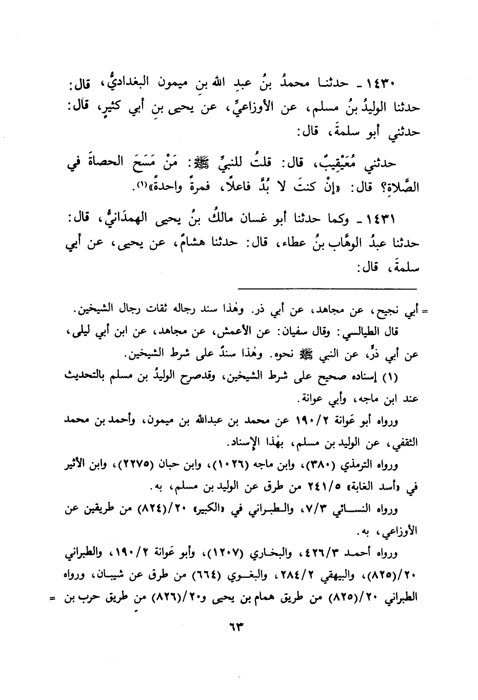 1431 - وَكَمَا حَدَّثَنَا أَبُو غَسَّانَ مَالِكُ بْنُ يَحْيَى الْهَمْدَانِيُّ قَالَ: حَدَّثَنَا عَبْدُ الْوَهَّابِ بْنُ عَطَاءٍ , قَالَ: حَدَّثَنَا هِشَامٌ , عَنْ يَحْيَى , عَنْ أَبِي سَلَمَةَ , قَالَ: -[64]- حَدَّثَنِي مُعَيْقِيبٌ " أَنَّ النَّبِيَّ صَلَّى اللَّهُ عَلَيْهِ وَسَلَّمَ قِيلَ لَهُ الْمَسْحُ عَلَى الْحَصَى؟ قَالَ: " إنْ كُنْتَ لَا بُدَّ فَاعِلًا فَوَاحِدَةً "