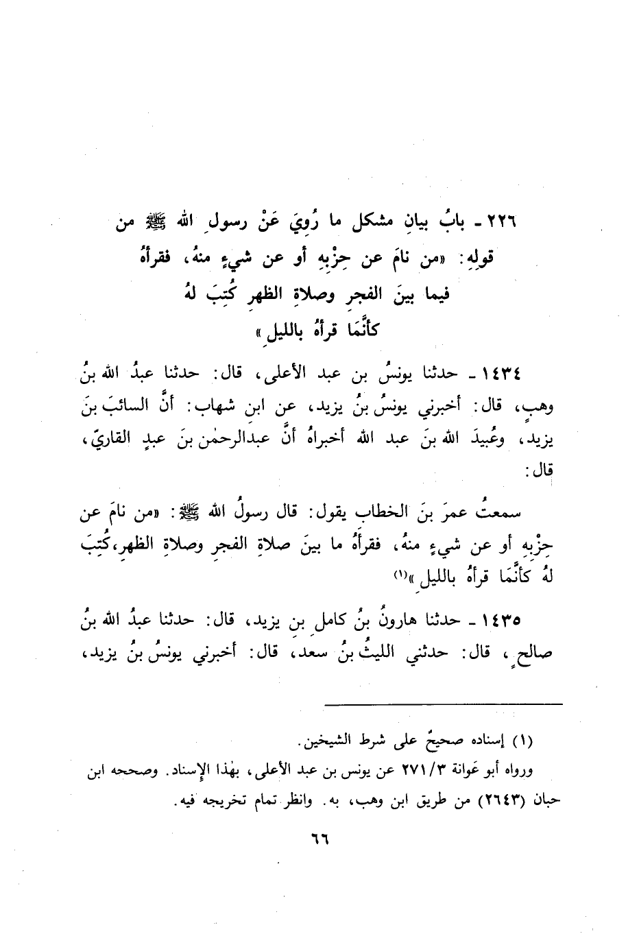 1434 - حَدَّثَنَا يُونُسُ بْنُ عَبْدِ الْأَعْلَى , قَالَ: حَدَّثَنَا عَبْدُ اللهِ بْنُ وَهْبٍ , قَالَ: أَخْبَرَنِي يُونُسُ بْنُ يَزِيدَ , عَنِ ابْنِ شِهَابٍ , أَنَّ السَّائِبَ بْنَ يَزِيدَ , وَعُبَيْدَ اللهِ بْنَ عَبْدِ اللهِ , أَخْبَرَاهُ أَنَّ عَبْدَ الرَّحْمَنِ بْنَ عَبْدٍ الْقَارِيَّ قَالَ: سَمِعْتُ عُمَرَ بْنَ الْخَطَّابِ , يَقُولُ: قَالَ رَسُولُ اللهِ صَلَّى اللَّهُ عَلَيْهِ وَسَلَّمَ: " مَنْ نَامَ عَنْ حِزْبِهِ أَوْ عَنْ شَيْءٍ مِنْهُ فَقَرَأَهُ مَا بَيْنَ صَلَاةِ الْفَجْرِ وَصَلَاةِ الظُّهْرِ كُتِبَ لَهُ كَأَنَّمَا قَرَأَهُ بِاللَّيْلِ "