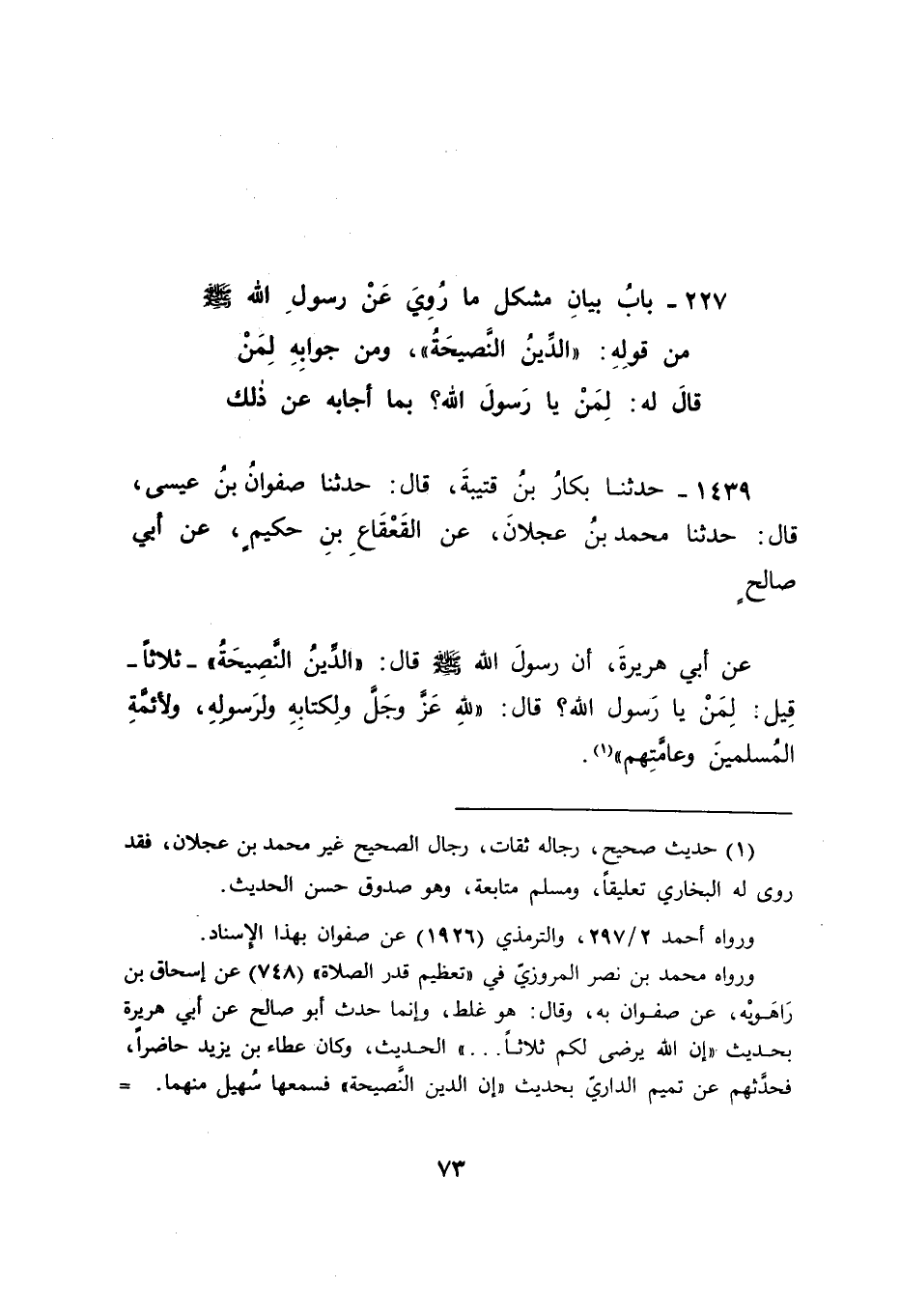 1439 - حَدَّثَنَا بَكَّارُ بْنُ قُتَيْبَةَ , قَالَ: حَدَّثَنَا صَفْوَانُ بْنُ عِيسَى , قَالَ: حَدَّثَنَا مُحَمَّدُ بْنُ عَجْلَانَ , عَنِ الْقَعْقَاعِ بْنِ حَكِيمٍ، عَنْ أَبِي صَالِحٍ , عَنْ أَبِي هُرَيْرَةَ , أَنَّ رَسُولَ اللهِ صَلَّى اللَّهُ عَلَيْهِ وَسَلَّمَ قَالَ: " الدِّينُ النَّصِيحَةُ ثَلَاثًا " قِيلَ لِمَنْ يَا رَسُولَ اللهِ؟ قَالَ: لِلَّهِ عَزَّ وَجَلَّ وَلِكِتَابِهِ وَلِرَسُولِهِ وَلِأَئِمَّةِ الْمُسْلِمِينَ وَعَامَّتِهِمْ " -[74]-