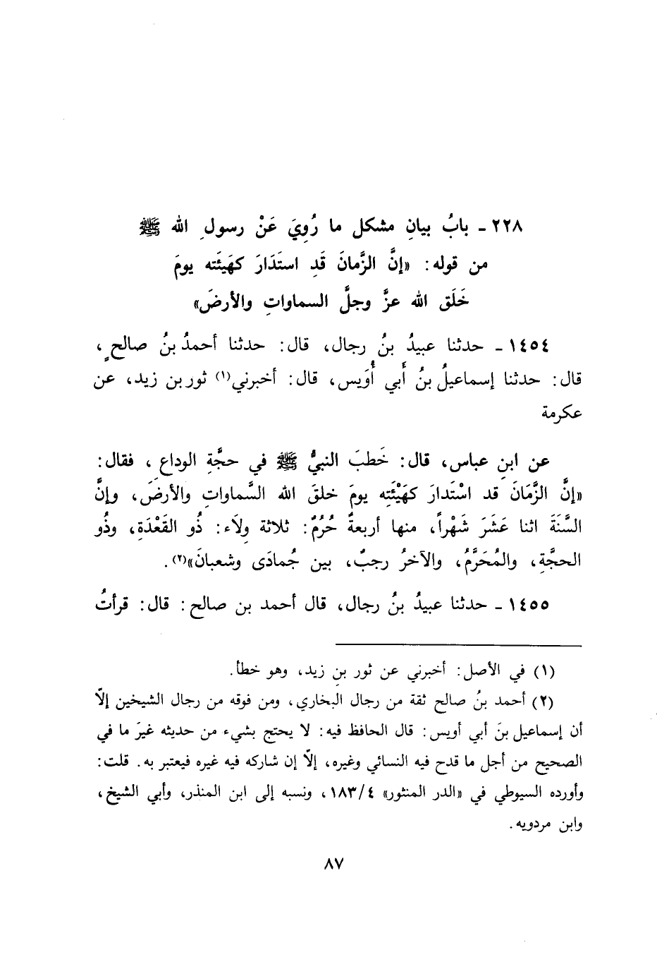 1454 - حَدَّثَنَا عُبَيْدُ بْنُ رِجَالٍ , قَالَ: حَدَّثَنَا أَحْمَدُ بْنُ صَالِحٍ , قَالَ: حَدَّثَنَا إسْمَاعِيلُ بْنُ أَبِي أُوَيْسٍ , قَالَ أَخْبَرَنِي ثَوْرُ بْنُ زَيْدٍ , عَنْ عِكْرِمَةَ , عَنِ ابْنِ عَبَّاسٍ , قَالَ: " خَطَبَ النَّبِيُّ صَلَّى اللَّهُ عَلَيْهِ وَسَلَّمَ فِي حَجَّةِ الْوَدَاعِ فَقَالَ: " إنَّ الزَّمَانَ قَدِ اسْتَدَارَ كَهَيْئَتِهِ يَوْمَ خَلَقَ اللهُ السَّمَوَاتِ وَالْأَرْضَ , وَإِنَّ السَّنَةَ اثْنَا عَشَرَ شَهْرًا مِنْهَا أَرْبَعَةٌ حُرُمٌ: ثَلَاثَةٌ وِلَاءٌ: ذُو الْقَعْدَةِ وَذُو الْحِجَّةِ وَالْمُحَرَّمُ , وَالْآخِرُ رَجَبٌ بَيْنَ جُمَادَى وَشَعْبَانَ "