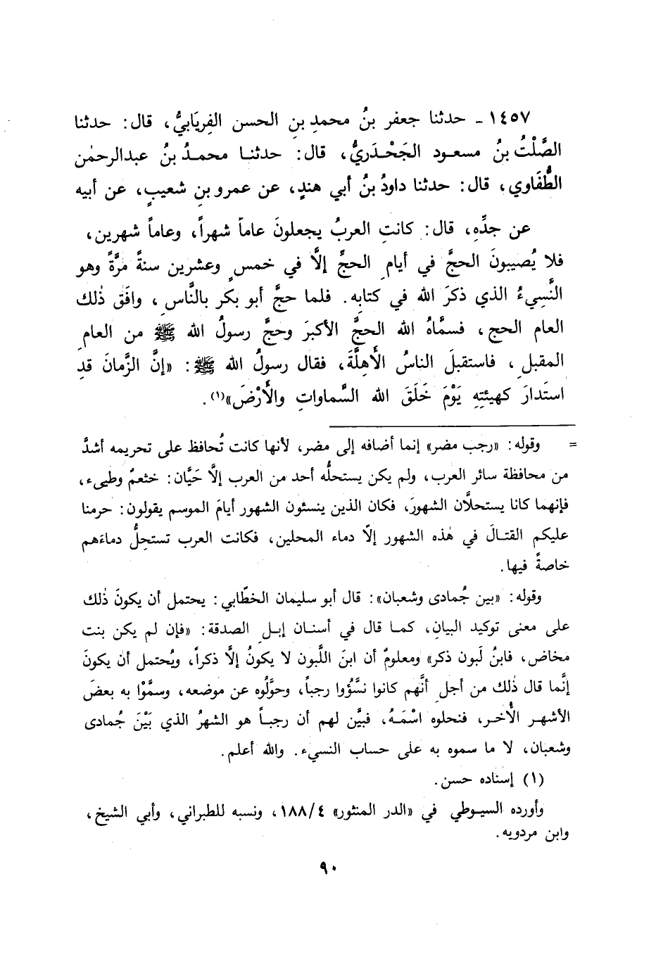 1457 - حَدَّثَنَا جَعْفَرُ بْنُ مُحَمَّدِ بْنِ الْحَسَنِ الْفِرْيَابِيُّ , قَالَ: حَدَّثَنَا الصَّلْتُ بْنُ مَسْعُودٍ الْجَحْدَرِيُّ , قَالَ: حَدَّثَنَا مُحَمَّدُ بْنُ عَبْدِ الرَّحْمَنِ الطُّفَاوِيُّ , قَالَ: حَدَّثَنَا دَاوُدَ بْنُ أَبِي هِنْدٍ , عَنْ عَمْرِو بْنِ شُعَيْبٍ , عَنْ أَبِيهِ , عَنْ جَدِّهِ , قَالَ: " كَانَتْ الْعَرَبُ يَجْعَلُونَ عَامًا شَهْرًا وَعَامًا شَهْرَيْنِ فَلَا يُصِيبُونَ الْحَجَّ فِي أَيَّامِ الْحَجِّ إلَّا فِي خَمْسٍ وَعِشْرِينَ سَنَةً مَرَّةً , وَهُوَ النَّسِيءُ الَّذِي ذَكَرَ اللهُ فِي كِتَابِهِ فَلَمَّا حَجَّ أَبُو بَكْرٍ بِالنَّاسِ وَافَقَ ذَلِكَ الْعَامُ الْحَجَّ فَسَمَّاهُ اللهُ الْحَجَّ الْأَكْبَرَ وَحَجَّ رَسُولُ اللهِ صَلَّى اللَّهُ عَلَيْهِ وَسَلَّمَ مِنَ الْعَامِ الْمُقْبِلِ فَاسْتَقْبَلَ النَّاسُ الْأَهِلَّةَ فَقَالَ رَسُولُ اللهِ صَلَّى اللَّهُ عَلَيْهِ وَسَلَّمَ: " إنَّ الزَّمَانَ قَدِ اسْتَدَارَ كَهَيْئَتِهِ يَوْمَ خَلَقَ اللهُ السَّمَوَاتِ وَالْأَرْضَ " -[91]- قَالَ أَبُو جَعْفَرٍ: فَفِي حَدِيثِ جَعْفَرٍ هَذَا الَّذِي رَدَّهُ إِلَى عَبْدِ اللهِ بْنِ عَمْرٍو وَمَا قَدْ دَلَّ عَلَى اسْتِدَارَةِ الزَّمَانِ حَتَّى صَارَ كَهَيْئَتِهِ يَوْمَ خَلَقَ اللهُ السَّمَوَاتِ وَالْأَرْضَ , وَفِيهِ الْمَعْنَى الْمُرَادُ بِقَوْلِ اللهِ عَزَّ وَجَلَّ {وَأَذَانٌ مِنَ اللهِ وَرَسُولِهِ إلَى النَّاسِ يَوْمَ الْحَجِّ الْأَكْبَرِ} [التوبة: 3] أَنَّ قَوْلَهُ عَزَّ وَجَلَّ " {الْأَكْبَرِ} [التوبة: 3] " فِي هَذِهِ الْآيَةِ إنَّمَا هُوَ نَعْتٌ لِلْحَجِّ لَا لِمَا سِوَاهُ مِمَّا قَدِ اخْتَلَفَ النَّاسُ فِيهِ فَقَالَ: بَعْضُهُمْ إنَّهُ يَوْمُ النَّحْرِ , وَإِنْ كَانَ ذَلِكَ قَدْ رَوَوْهُ عَنِ النَّبِيِّ صَلَّى اللَّهُ عَلَيْهِ وَسَلَّمَ