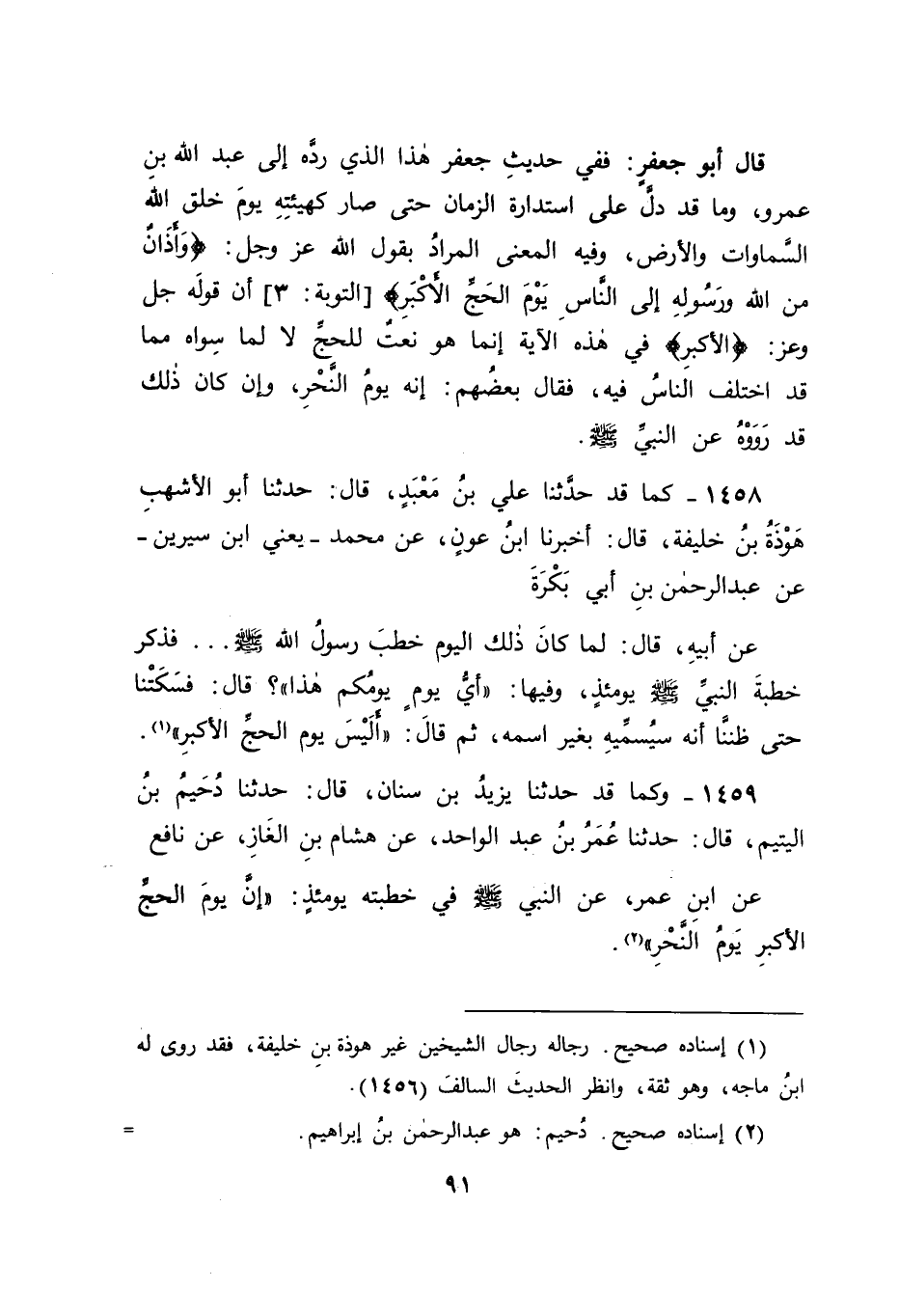 1459 - وَكَمَا قَدْ حَدَّثَنَا يَزِيدُ بْنُ سِنَانٍ , قَالَ: حَدَّثَنَا دُحَيْمُ بْنُ الْيَتِيمِ , قَالَ: حَدَّثَنَا عُمَرُ بْنُ عَبْدِ الْوَاحِدِ , عَنْ هِشَامِ بْنِ الْغَازِ , عَنْ نَافِعٍ , عَنِ ابْنِ عُمَرَ , عَنِ النَّبِيِّ صَلَّى اللَّهُ عَلَيْهِ وَسَلَّمَ فِي خُطْبَتِهِ يَوْمَئِذٍ: " إنَّ يَوْمَ الْحَجِّ الْأَكْبَرِ يَوْمُ النَّحْرِ " -[92]-