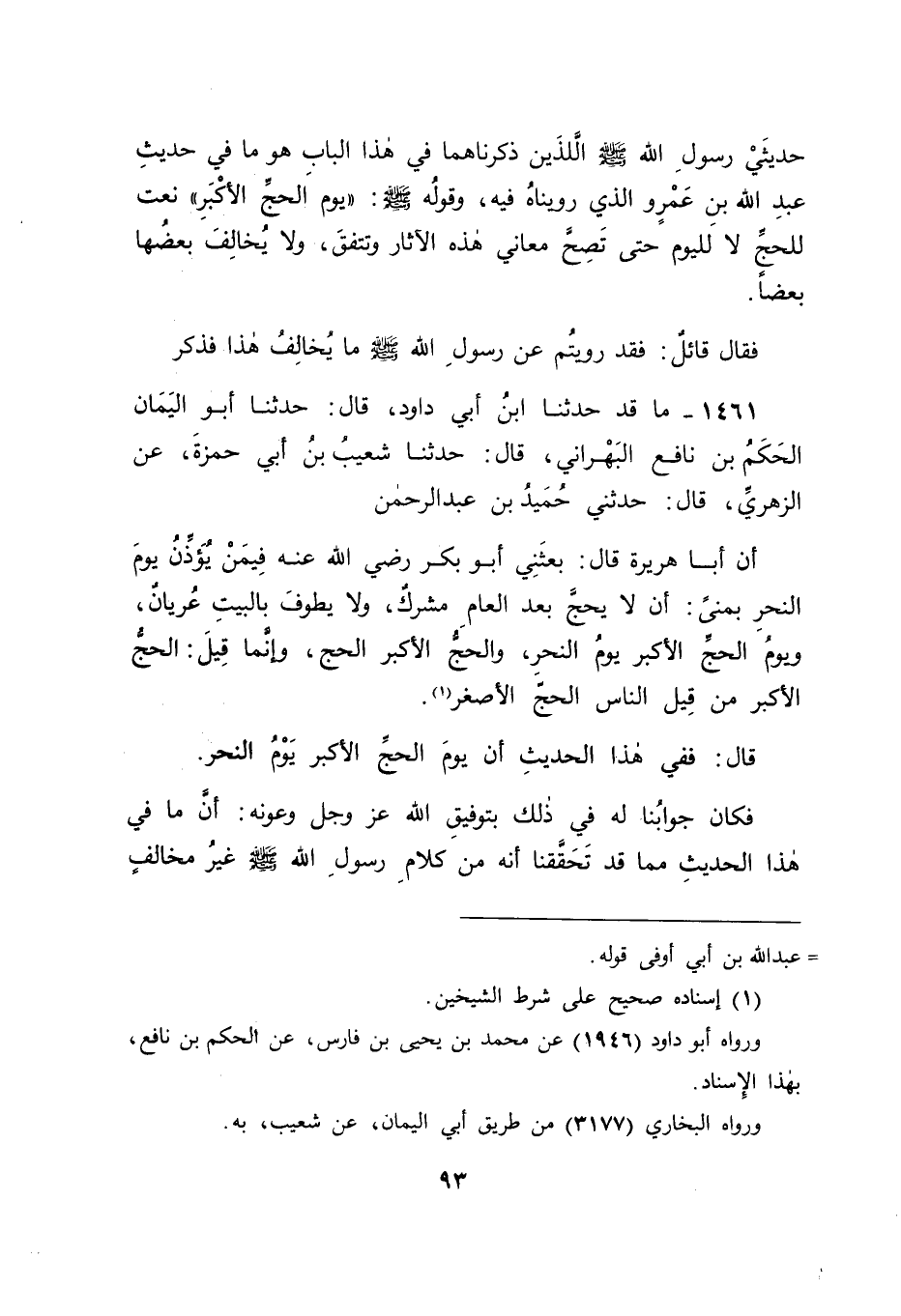 1461 - فَذَكَرَ مَا قَدْ حَدَّثَنَا ابْنُ أَبِي دَاوُدَ , قَالَ: حَدَّثَنَا أَبُو الْيَمَانِ الْحَكَمُ بْنُ نَافِعٍ الْبَهْرَانِيُّ , قَالَ: حَدَّثَنَا شُعَيْبُ بْنُ أَبِي حَمْزَةَ , عَنِ الزُّهْرِيِّ , قَالَ: حَدَّثَنِي حُمَيْدُ بْنُ عَبْدِ الرَّحْمَنِ , أَنَّ أَبَا هُرَيْرَةَ , قَالَ: " بَعَثَنِي أَبُو بَكْرٍ رَضِيَ اللهُ عَنْهُ فِيمَنْ يُؤَذِّنُ يَوْمَ النَّحْرِ بِمِنًى أَنْ لَا يَحُجَّ بَعْدَ الْعَامِ مُشْرِكٌ , وَلَا يَطُوفَ بِالْبَيْتِ عُرْيَانٌ، وَيَوْمُ الْحَجِّ الْأَكْبَرِ يَوْمُ النَّحْرِ , وَالْحَجُّ الْأَكْبَرُ الْحَجُّ " وَإِنَّمَا قِيلَ: الْحَجُّ الْأَكْبَرُ مِنْ قِيلَ النَّاسِ: الْحَجُّ الْأَصْغَرُ قَالَ: فَفِي هَذَا الْحَدِيثِ أَنَّ يَوْمَ الْحَجِّ الْأَكْبَرِ يَوْمُ النَّحْرِ فَكَانَ جَوَابَنَا لَهُ فِي ذَلِكَ بِتَوْفِيقِ اللهِ عَزَّ وَجَلَّ وَعَوْنِهِ أَنَّ مَا فِي هَذَا الْحَدِيثِ مِمَّا قَدْ تَحَقَّقْنَا أَنَّهُ مِنْ كَلَامِ رَسُولِ اللهِ صَلَّى اللَّهُ عَلَيْهِ وَسَلَّمَ غَيْرُ مُخَالِفٍ -[94]- لِمَا قَدْ رَوَيْنَاهُ قَبْلَهُ فِي هَذَا الْبَابِ إذْ كَانَ قَوْلُهُ: وَيَوْمُ الْحَجِّ الْأَكْبَرِ يَوْمُ النَّحْرِ قَدْ يَحْتَمِلُ أَنْ يَكُونَ قَوْلُهُ: {الْأَكْبَرِ} [التوبة: 3] نَعْتًا لِلْحَجِّ لَا لِلْيَوْمِ وَيَكُونُ ذَلِكَ مُوَافِقًا لِحَدِيثِ عَبْدِ اللهِ بْنِ عَمْرٍو الَّذِي رَوَيْنَاهُ فِي هَذَا الْبَابِ , وَيَكُونُ الْيَوْمُ مُضَافًا إلَيْهِ حَتَّى تَصِحَّ هَذِهِ الْآثَارُ كُلُّهَا لَا يُضَادُّ شَيْءٌ مِنْهَا شَيْئًا ثُمَّ قَالَ: هَذَا الْقَائِلُ وَفِي هَذَا الْحَدِيثِ , وَإِنَّمَا قِيلَ: الْحَجُّ الْأَكْبَرُ مِنْ أَجْلِ قَوْلِ النَّاسِ: الْحَجُّ الْأَصْغَرُ فَاسْتَدَلَّ بِذَلِكَ فِيمَا ذَكَرَ عَلَى أَنَّهُ إنَّمَا قِيلَ لِلْحَجِّ الَّذِي كَانَ عَامَئِذٍ الْحَجُّ الْأَكْبَرُ الْقَوْلُ الَّذِي كَانَ النَّاسُ يَقُولُونَهُ الْحَجُّ الْأَصْغَرُ قَالَ: وَهَذَا خِلَافُ مَا فِي حَدِيثِ عَبْدِ اللهِ بْنِ عَمْرٍو الَّذِي رَوَيْتُمُوهُ فَكَانَ جَوَابَنَا لَهُ فِي ذَلِكَ بِتَوْفِيقِ اللهِ عَزَّ وَجَلَّ وَعَوْنِهِ أَنَّ الَّذِي فِي هَذَا الْحَدِيثِ مِنْ قَوْلِ النَّاسِ: الْحَجُّ الْأَصْغَرُ لَا يُدْرَى مَا هُوَ؟ وَلَا عَنْ مَنْ حُكِيَ مِنْ رُوَاةِ هَذَا الْحَدِيثِ؟ وَقَدْ يَحْتَمِلُ أَنْ يَكُونَ مِنْ كَلَامِ الزُّهْرِيِّ فَإِنَّهُ قَدْ كَانَ يَفْعَلُ ذَلِكَ كَثِيرًا يَخْلِطُ كَلَامَهُ بِالْحَدِيثِ فَيُتَوَهَّمُ أَنَّهُ مِنْهُ وَلَيْسَ هُوَ مِنْهُ , وَلِذَلِكَ قَالَ لَهُ مُوسَى بْنُ عُقْبَةَ: افْصِلْ كَلَامَ رَسُولِ اللهِ صَلَّى اللَّهُ عَلَيْهِ وَسَلَّمَ مِنْ كَلَامِكَ , وَإِذَا كَانَ ذَلِكَ الْكَلَامُ يَحْتَمِلُ مَا قَدْ ذَكَرْنَا كَانَ مَا قَدْ رَوَيْنَاهُ عَنْ عَبْدِ اللهِ بْنِ عَمْرٍو مِنْ حَقِيقَةِ الْمَعْنَى كَانَ فِي ذَلِكَ أَوْلَى مِنْهُ , وَكَانَ مَا قَالَ: مِنْ ذَلِكَ مَعْقُولًا إذَا كَانَ الْحَجُّ بَعْدَ اسْتِدَارَةِ الزَّمَانِ رَجَعَ إلَى شَهْرٍ بِعَيْنِهِ يَجْرِي عَلَيْهِ حَجُّ النَّاسِ إلَى يَوْمِ الْقِيَامَةِ فَكَانَ ذَلِكَ إمَامًا -[95]- لَهُمْ ; كَانَ الْأَكْبَرُ مِنَ الْحَجِّ الَّذِي يَرْجِعُ إلَيْهِ غَيْرُهُ مِنَ الْحَجِّ الَّذِي يَكُونُ بَعْدَهُ إلَى يَوْمِ الْقِيَامَةِ مِنْ قُدْوَةِ أَهْلِهِ لِمَا فِيهِ، وَفِي ذَلِكَ مَا قَدْ وَجَبَ لَهُ مَا قَالَهُ فِيهِ عَبْدُ اللهِ بْنُ عَمْرٍو وَاللهَ نَسْأَلُهُ التَّوْفِيقَ