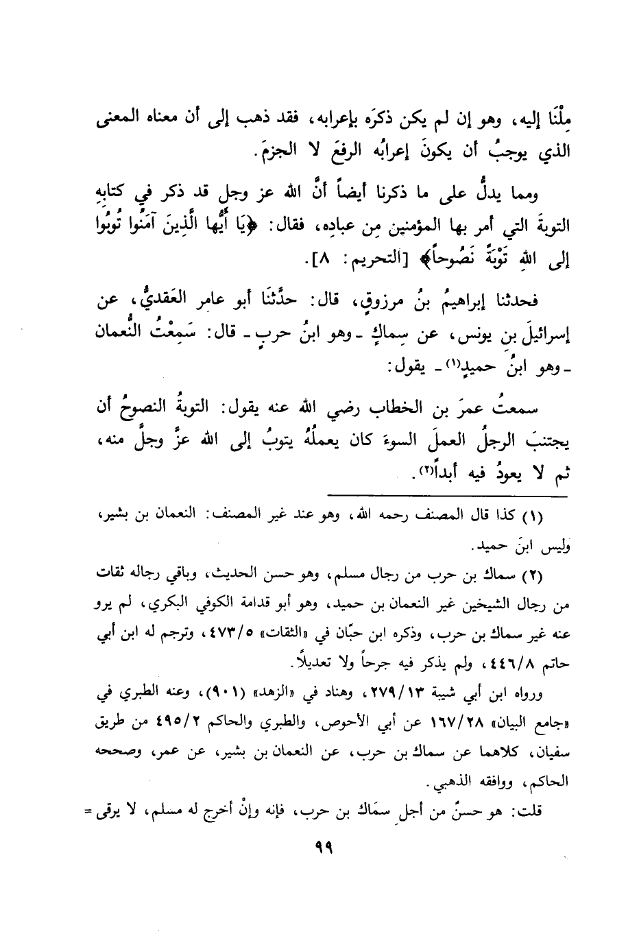 فَحَدَّثَنَا إبْرَاهِيمُ بْنُ مَرْزُوقٍ قَالَ: حَدَّثَنَا أَبُو عَامِرٍ الْعَقَدِيُّ عَنْ إسْرَائِيلَ بْنِ يُونُسَ عَنْ سِمَاكٍ وَهُوَ ابْنُ حَرْبٍ قَالَ: سَمِعْتُ النُّعْمَانَ وَهُوَ ابْنُ حُمَيْدٍ يَقُولُ: سَمِعْتُ عُمَرَ بْنَ الْخَطَّابِ رَضِيَ اللهُ عَنْهُ يَقُولُ: " التَّوْبَةُ النَّصُوحُ أَنْ يَجْتَنِبَ الرَّجُلُ الْعَمَلَ السُّوءَ كَانَ يَعْمَلُهُ يَتُوبُ إلَى اللهِ عَزَّ وَجَلَّ مِنْهُ ثُمَّ لَا يَعُودُ فِيهِ أَبَدًا " -[100]- فَكَانَ ذَلِكَ مِمَّا قَدْ دَلَّكَ عَلَى مَا ذَكَرْنَا مِنْ تَأْوِيلِ الْحَدِيثِ الَّذِي رَوَيْنَاهُ وَمِنْ ذَلِكَ مَا قَدْ رُوِيَ عَنِ النَّبِيِّ صَلَّى اللَّهُ عَلَيْهِ وَسَلَّمَ فِي النَّدَمِ أَنَّهُ تَوْبَةٌ