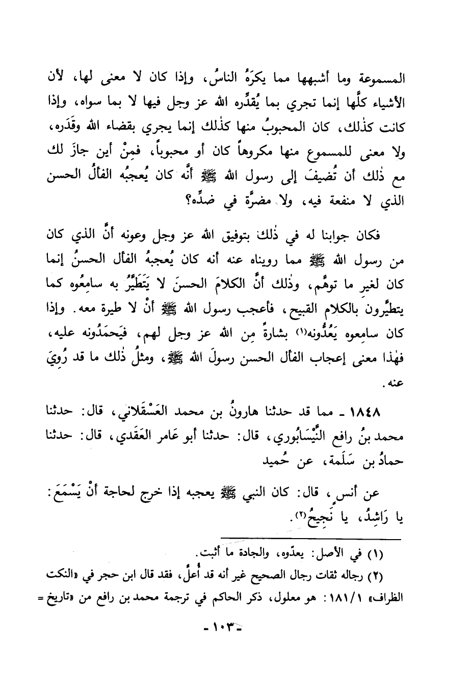 1848 - مِمَّا قَدْ حَدَّثَنَا هَارُونُ بْنُ مُحَمَّدٍ الْعَسْقَلَانِيُّ قَالَ: حَدَّثَنَا مُحَمَّدُ بْنُ رَافِعٍ النَّيْسَابُورِيُّ قَالَ: حَدَّثَنَا أَبُو عَامِرٍ الْعَقَدِيُّ قَالَ: حَدَّثَنَا حَمَّادُ بْنُ سَلَمَةَ , عَنْ حُمَيْدٍ , عَنْ أَنَسٍ قَالَ: كَانَ النَّبِيُّ صَلَّى اللَّهُ عَلَيْهِ وَسَلَّمَ يُعْجِبُهُ إِذَا خَرَجَ لِحَاجَةٍ أَنْ يَسْمَعَ: يَا رَاشِدُ يَا نَجِيحُ ". -[104]- فَكَانَ فِي ذَلِكَ مَا إِذَا سَمِعَهُ خَارِجٌ إِلَى حَاجَةٍ حَمِدَ اللهَ عَلَيْهِ , وَرَجَا بِهِ الْوُصُولَ إِلَى حَاجَتِهِ , بِمَنِّ اللهِ عَلَيْهِ وَتَوْفِيقِهَا لَهُ