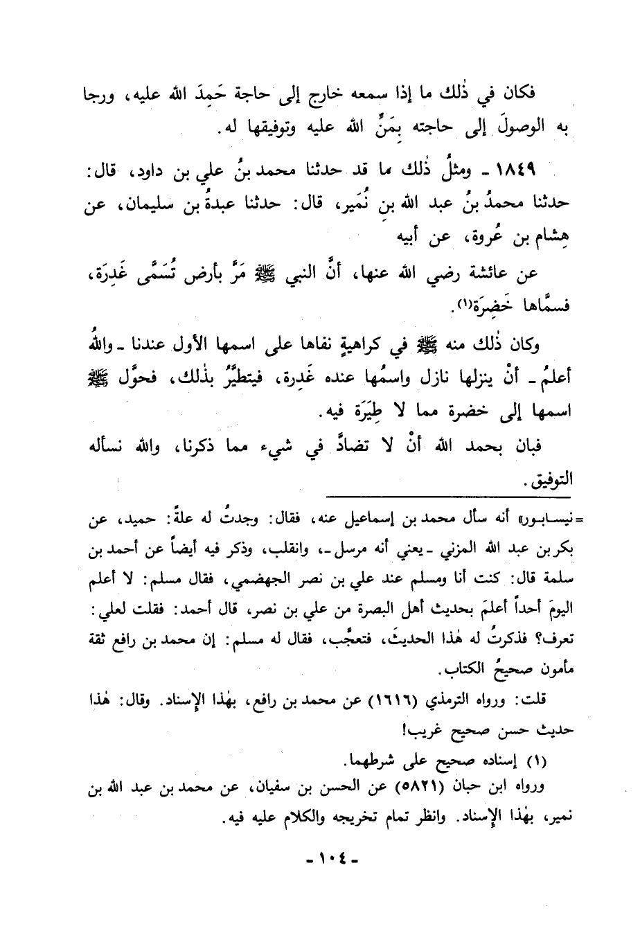 1849 - وَمِثْلُ ذَلِكَ مَا قَدْ حَدَّثَنَا مُحَمَّدُ بْنُ عَلِيِّ بْنِ دَاوُدَ قَالَ: حَدَّثَنَا مُحَمَّدُ بْنُ عَبْدِ اللهِ بْنِ نُمَيْرٍ قَالَ: حَدَّثَنَا عَبْدَةُ بْنُ سُلَيْمَانَ , عَنْ هِشَامِ بْنِ عُرْوَةَ , عَنْ أَبِيهِ , عَنْ عَائِشَةَ رَضِيَ اللهُ عَنْهَا: أَنَّ النَّبِيَّ صَلَّى اللَّهُ عَلَيْهِ وَسَلَّمَ مَرَّ بِأَرْضٍ تُسَمَّى غَدِرَةً , فَسَمَّاهَا خَضِرَةً. وَكَانَ ذَلِكَ مِنْهُ صَلَّى اللَّهُ عَلَيْهِ وَسَلَّمَ فِي كَرَاهِيَةٍ نَفَاهَا عَلَى اسْمِهَا الْأَوَّلِ عَنْدَنَا - وَاللهُ أَعْلَمُ - أَنْ يَنْزِلَهَا نَازِلٌ وَاسْمُهَا عَنْدَهُ غَدِرَةٌ , فَيَتَطَيَّرُ بِذَلِكَ , فَحَوَّلَ صَلَّى اللَّهُ عَلَيْهِ وَسَلَّمَ اسْمَهَا إِلَى خَضِرَةٍ , مِمَّا لَا طِيَرَةَ فِيهِ , فَبَانَ بِحَمْدِ اللهِ أَنْ لَا تَضَادَّ فِي شَيْءٍ مِمَّا ذَكَرْنَا , وَاللهَ نَسْأَلُهُ التَّوْفِيقَ