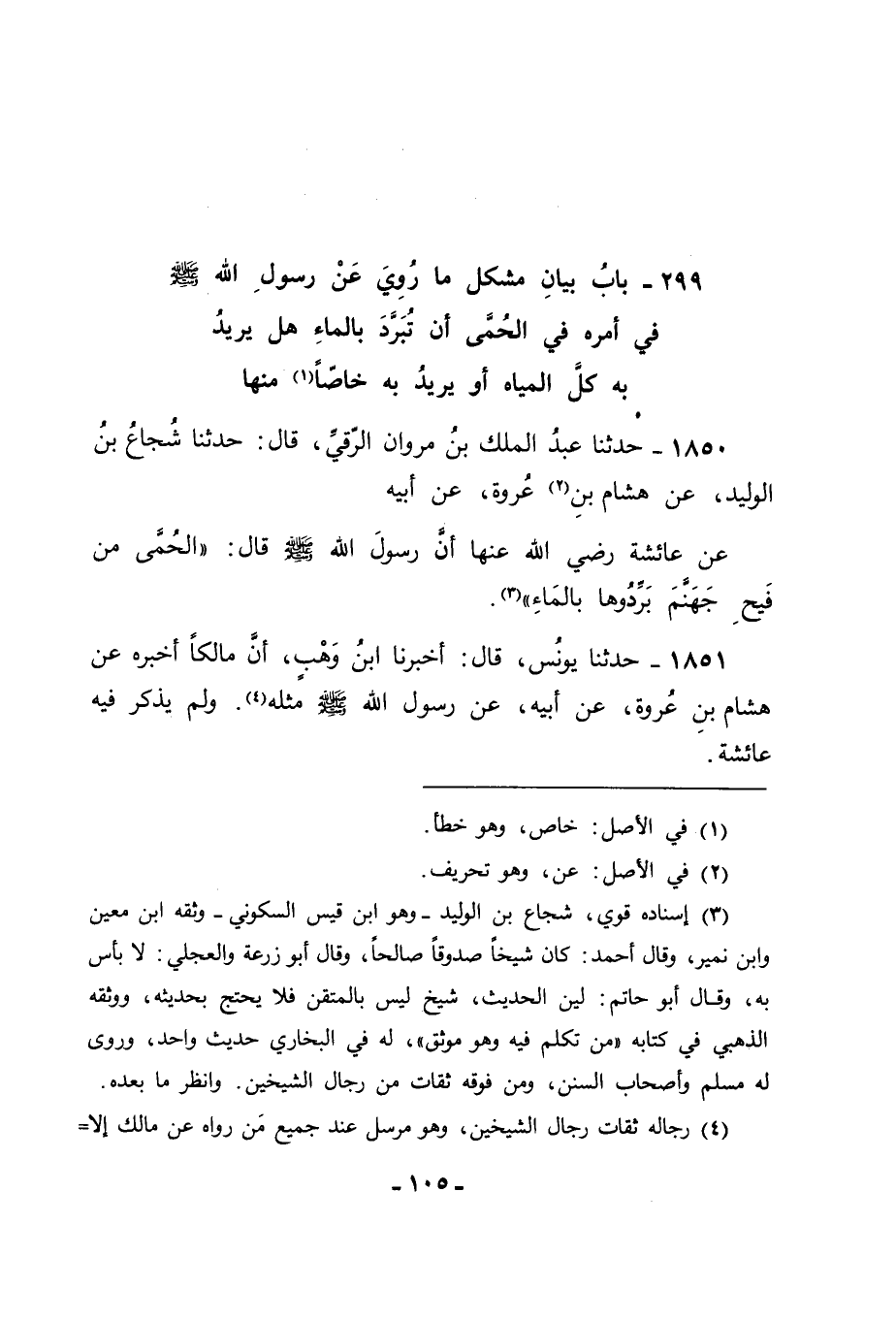 1850 - حَدَّثَنَا عَبْدُ الْمَلِكِ بْنُ مَرْوَانَ الرَّقِّيُّ قَالَ: حَدَّثَنَا شُجَاعُ بْنُ الْوَلِيدِ , عَنْ هِشَامِ بْنِ عُرْوَةَ , عَنْ أَبِيهِ , عَنْ عَائِشَةَ رَضِيَ اللهُ عَنْهَا , أَنَّ رَسُولَ اللهِ صَلَّى اللَّهُ عَلَيْهِ وَسَلَّمَ قَالَ: " الْحُمَّى مِنْ فَيْحِ جَهَنَّمَ , بَرِّدُوهَا بِالْمَاءِ ".