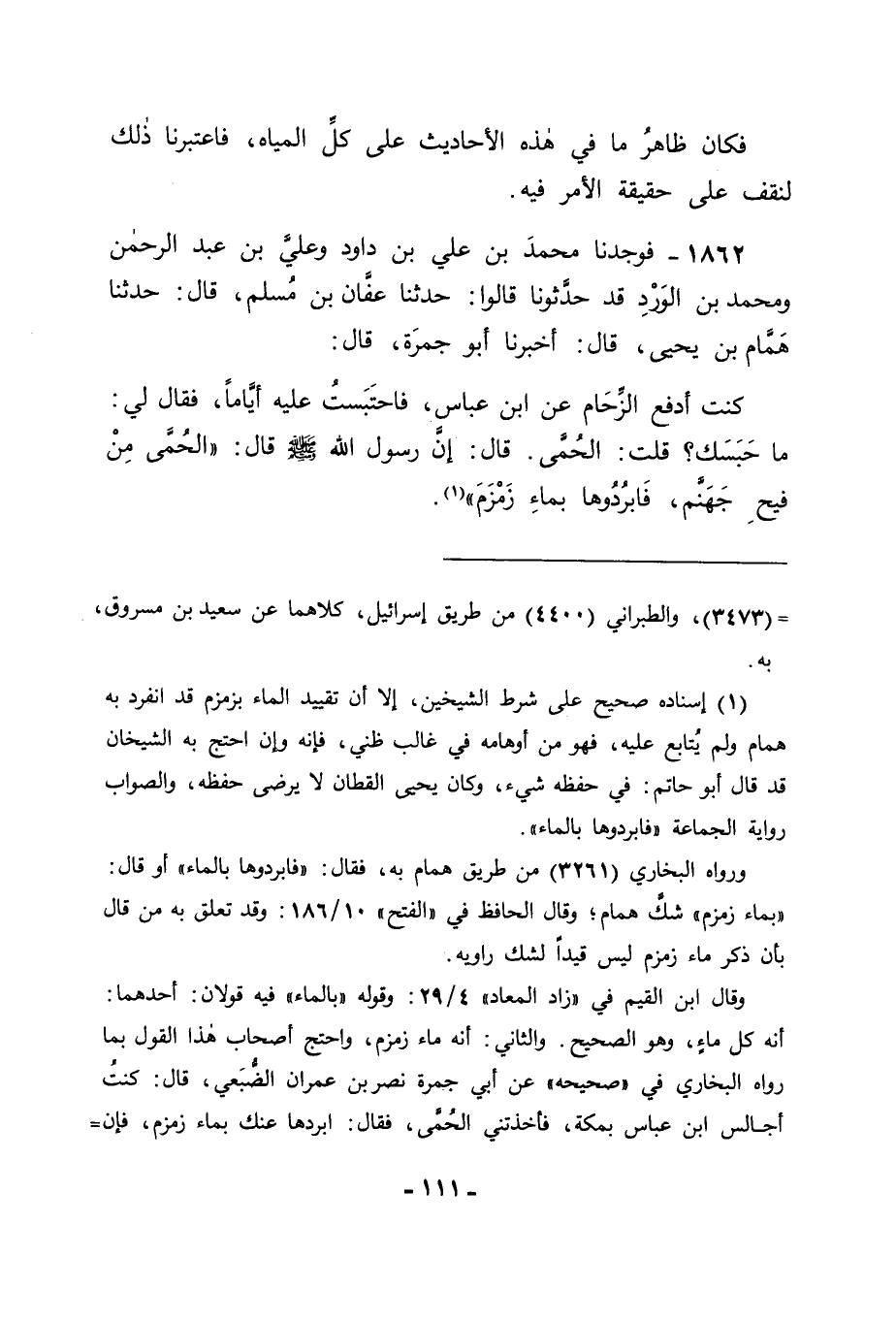 1862 - فَوَجَدْنَا مُحَمَّدَ بْنَ عَلِيِّ بْنِ دَاوُدَ , وَعَلِيَّ بْنَ عَبْدِ الرَّحْمَنِ , وَمُحَمَّدَ بْنَ الْوَرْدِ قَدْ حَدَّثُونَا قَالُوا: حَدَّثَنَا عَفَّانَ بْنُ مُسْلِمٍ قَالَ: حَدَّثَنَا هَمَّامُ بْنُ يَحْيَى قَالَ: أَخْبَرَنَا أَبُو جَمْرَةَ قَالَ: كُنْتُ أَدْفَعُ الزِّحَامَ عَنِ ابْنِ عَبَّاسٍ , فَاحْتَبَسْتُ عَلَيْهِ أَيَّامًا , فَقَالَ لِي: مَا حَبَسَكَ؟ قُلْتُ: الْحُمَّى , قَالَ: إِنَّ رَسُولَ اللهِ صَلَّى اللَّهُ عَلَيْهِ وَسَلَّمَ قَالَ: " الْحُمَّى مِنْ فَيْحِ جَهَنَّمَ فَأَبْرِدُوهَا بِمَاءِ زَمْزَمَ ". -[112]- قَالَ: فَعَقَلْنَا بِذَلِكَ أَنَّ الْمَاءَ الَّذِي أَرَادَهُ رَسُولُ اللهِ صَلَّى اللَّهُ عَلَيْهِ وَسَلَّمَ فِي الْأَحَادِيثِ الْأُوَلِ هُوَ مَاءُ زَمْزَمَ لَا مَا سِوَاهُ مِنَ الْمِيَاهِ , وَوَكَّدَ ذَلِكَ عَنْدَنَا مَا قَدْ رَوَاهُ أَبُو ذَرٍّ , عَنْ رَسُولِ اللهِ صَلَّى اللَّهُ عَلَيْهِ وَسَلَّمَ