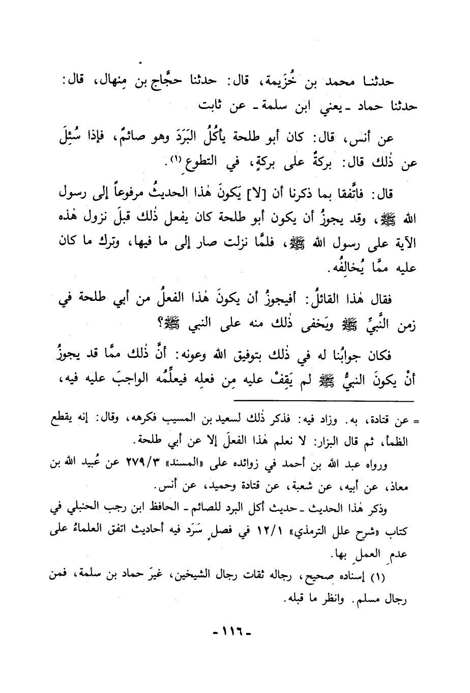 حَدَّثَنَا مُحَمَّدُ بْنُ خُزَيْمَةَ قَالَ: حَدَّثَنَا حَجَّاجُ بْنُ مِنْهَالٍ قَالَ: حَدَّثَنَا حَمَّادٌ يَعْنِي ابْنَ سَلَمَةَ , عَنْ ثَابِتٍ , عَنْ أَنَسٍ قَالَ كَانَ أَبُو طَلْحَةَ يَأْكُلُ الْبَرَدَ وَهُوَ صَائِمٌ , فَإِذَا سُئِلَ عَنْ ذَلِكَ قَالَ: " بَرَكَةٌ عَلَى بَرَكَةٍ فِي التَّطَوُّعِ ". قَالَ: فَاتَّفَقَا بِمَا ذَكَرْنَا أَنْ لَا يَكُونَ هَذَا الْحَدِيثُ مَرْفُوعًا إِلَى رَسُولِ اللهِ صَلَّى اللَّهُ عَلَيْهِ وَسَلَّمَ , وَقَدْ يَجُوزُ أَنْ يَكُونَ أَبُو طَلْحَةَ كَانَ يَفْعَلُ ذَلِكَ قَبْلَ نُزُولِ هَذِهِ الْآيَةِ عَلَى رَسُولِ اللهِ صَلَّى اللَّهُ عَلَيْهِ وَسَلَّمَ , فَلَمَّا نَزَلَتْ صَارَ إِلَى مَا فِيهَا وَتَرَكَ مَا كَانَ عَلَيْهِ مِمَّا يُخَالِفُهُ. فَقَالَ هَذَا الْقَائِلُ: أَفَيَجُوزُ أَنْ يَكُونَ هَذَا الْفِعْلُ مِنْ أَبِي طَلْحَةَ فِي زَمَنِ النَّبِيِّ صَلَّى اللَّهُ عَلَيْهِ وَسَلَّمَ وَيَخْفَى ذَلِكَ مِنْهُ عَلَى النَّبِيِّ صَلَّى اللَّهُ عَلَيْهِ وَسَلَّمَ؟ فَكَانَ جَوَابَنَا لَهُ فِي ذَلِكَ بِتَوْفِيقِ اللهِ وَعَوْنِهِ: أَنَّ ذَلِكَ مِمَّا قَدْ يَجُوزُ أَنْ يَكُونَ النَّبِيُّ صَلَّى اللَّهُ عَلَيْهِ وَسَلَّمَ لَمْ يَقِفْ عَلَيْهِ مِنْ فِعْلِهِ , فَيُعَلِّمُهُ الْوَاجِبَ عَلَيْهِ فِيهِ , -[117]- وَقَدْ كَانَ مِثْلُ هَذَا فِي عَهْدِ النَّبِيِّ صَلَّى اللَّهُ عَلَيْهِ وَسَلَّمَ مِمَّا ذَكَرَهُ رِفَاعَةُ بْنُ رَافِعٍ الْأَنْصَارِيُّ , لَعُمَرَ بْنِ الْخَطَّابِ رَضِيَ اللهُ عَنْهُ مُحْتَجًّا بِهِ عَلَيْهِ فِيمَا كَانُوا عَلَيْهِ مِنَ الْمَاءِ , فَكَشَفَهُ عُمَرُ بْنُ الْخَطَّابِ عَنْ ذَلِكَ: أَذَكَرْتُمُوهُ لِلنَّبِيِّ صَلَّى اللَّهُ عَلَيْهِ وَسَلَّمَ فَأَقَرَّكُمْ عَلَيْهِ؟ فَقَالَ: لَا , فَلَمْ يَرَ ذَلِكَ عُمَرُ حُجَّةً