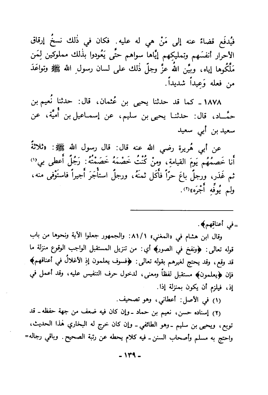 1878 - كَمَا قَدْ حَدَّثَنَا يَحْيَى بْنُ عُثْمَانَ قَالَ: حَدَّثَنَا نُعَيْمُ بْنُ حَمَّادٍ قَالَ: حَدَّثَنَا يَحْيَى بْنُ سُلَيْمٍ , عَنْ إِسْمَاعِيلَ بْنِ أُمَيَّةَ , عَنْ سَعِيدِ بْنِ أَبِي سَعِيدٍ , عَنْ أَبِي هُرَيْرَةَ رَضِيَ اللهُ عَنْهُ قَالَ: قَالَ رَسُولُ اللهِ صَلَّى اللَّهُ عَلَيْهِ وَسَلَّمَ: " ثَلَاثَةٌ أَنَا خَصْمُهُمْ يَوْمَ الْقِيَامَةِ , وَمَنْ كُنْتُ خَصْمَهُ خَصَمْتُهُ: رَجُلٌ أَعْطَى بِي ثُمَّ غَدَرَ , وَرَجُلٌ بَاعَ حُرًّا فَأَكَلَ ثَمَنَهُ , وَرَجُلٌ اسْتَأْجَرَ أَجِيرًا فَاسْتَوْفَى مِنْهُ وَلَمْ يُوَفِّهِ أَجْرَهُ -[140]- قَالَ أَبُو جَعْفَرٍ فَكَانَ فِي ذَلِكَ تَحْرِيمُ أَثْمَانِ الْأَحْرَارِ عَلَى الْوُجُوهِ كُلِّهَا , وَكَانَ فِيمَا ذَكَرْنَا إِقَامَةُ الْحُجَّةِ لَنَا فِي تَرْكِنَا مَا رَوَيْنَاهُ فِي أَوَّلِ هَذَا الْبَابِ مِنْ حَدِيثِ رَسُولِ اللهِ صَلَّى اللَّهُ عَلَيْهِ وَسَلَّمَ الَّذِي رَوَيْنَاهُ فِيهِ إِلَى مَا نَسَخَهُ اللهُ فِي كِتَابِهِ , مِمَّا أَنْزَلَهُ فِيهِ مِمَّا تَلَوْنَا عَلَى لِسَانِ رَسُولِ اللهِ صَلَّى اللَّهُ عَلَيْهِ وَسَلَّمَ مِمَّا رَوَيْنَا , وَاللهَ نَسْأَلُهُ التَّوْفِيقَ