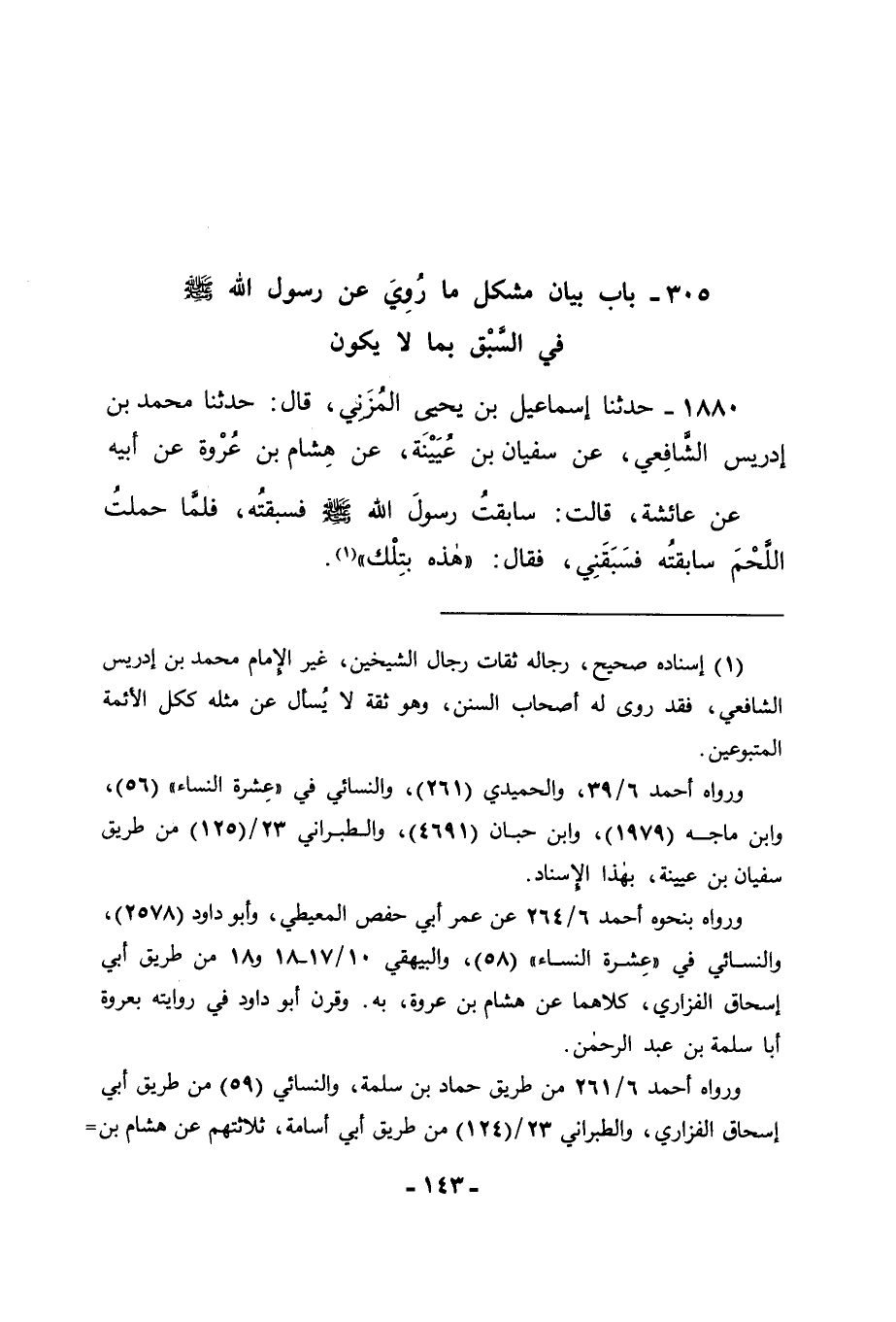 1880 - حَدَّثَنَا إِسْمَاعِيلُ بْنُ يَحْيَى الْمُزَنِيُّ قَالَ: حَدَّثَنَا مُحَمَّدُ بْنُ إِدْرِيسَ الشَّافِعِيُّ , عَنْ سُفْيَانَ بْنِ عُيَيْنَةَ , عَنْ هِشَامِ بْنِ عُرْوَةَ , عَنْ أَبِيهِ , عَنْ عَائِشَةَ قَالَتْ: سَابَقْتُ رَسُولَ اللهِ صَلَّى اللَّهُ عَلَيْهِ وَسَلَّمَ فَسَبَقْتُهُ , فَلَمَّا حَمَلْتُ اللَّحْمَ سَابَقْتُهُ فَسَبَقَنِي , فَقَالَ: " هَذِهِ بِتِلْكَ "