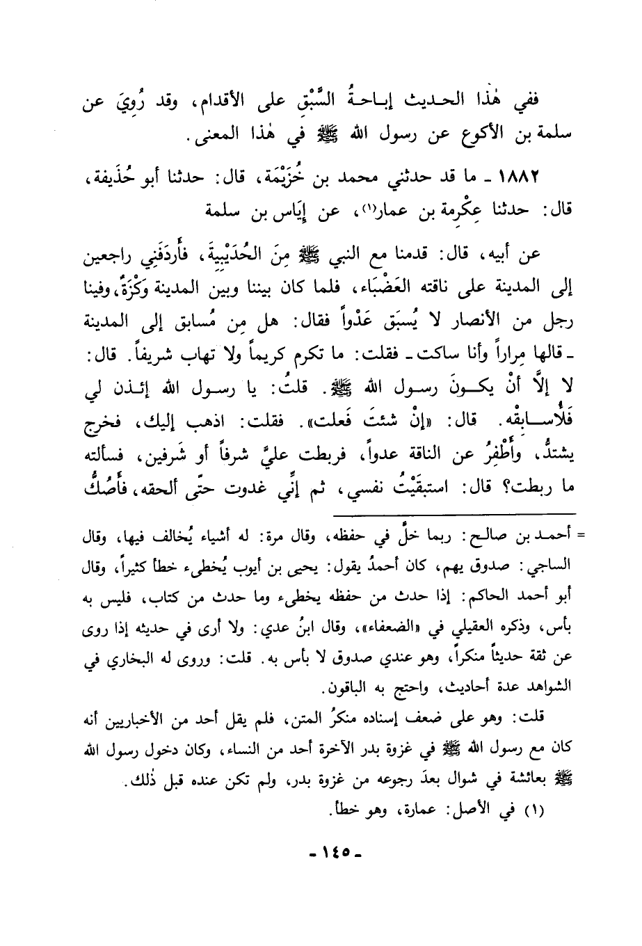 1882 - مَا قَدْ حَدَّثَنِي مُحَمَّدُ بْنُ خُزَيْمَةَ قَالَ: حَدَّثَنَا أَبُو حُذَيْفَةَ قَالَ: حَدَّثَنَا عِكْرِمَةُ بْنُ عَمَّارٍ , عَنْ إِيَاسِ بْنِ سَلَمَةَ , عَنْ أَبِيهِ قَالَ: قَدِمْنَا مَعَ النَّبِيِّ صَلَّى اللَّهُ عَلَيْهِ وَسَلَّمَ مِنَ الْحُدَيْبِيَةِ فَأَرْدَفَنِي رَاجِعِينَ إِلَى الْمَدِينَةِ عَلَى نَاقَتِهِ الْعَضْبَاءِ , فَلَمَّا كَانَ بَيْنَنَا وَبَيْنَ الْمَدِينَةِ وَكْزَةٌ وَفِينَا رَجُلٌ مِنَ الْأَنْصَارِ لَا يُسْبَقُ عَدْوًا , فَقَالَ: هَلْ مِنْ مُسَابِقٍ إِلَى الْمَدِينَةِ؟ قَالَهَا مِرَارًا وَأَنَا سَاكِتٌ , فَقُلْتُ: مَا تُكْرِمُ كَرِيمًا , وَلَا تَهَابُ شَرِيفًا , قَالَ: لَا , إِلَّا أَنْ يَكُونَ رَسُولَ اللهِ صَلَّى اللَّهُ عَلَيْهِ وَسَلَّمَ. قُلْتُ: يَا رَسُولَ اللهِ ائْذَنْ لِي فَلْأُسَابِقْهُ , قَالَ: " إِنْ شِئْتَ فَعَلْتَ " فَقُلْتُ: اذْهَبْ إِلَيْكَ , فَخَرَجَ يَشْتَدُّ وَأَطْفِرُ عَنِ النَّاقَةِ عَدْوًا , فَرَبَطْتُ عَلَيَّ شَرَفًا أَوْ شَرَفَيْنِ فَسَأَلْتُهُ: مَا رَبَطْتَ؟ قَالَ: اسْتَبْقَيْتُ نَفْسِي , ثُمَّ إِنِّي غَدَوْتُ حَتَّى أَلْحَقَهُ فَأَصُكَّ -[146]- بَيْنَ كَتِفَيْهِ , وَقُلْتُ: سَبَقْتُكَ وَاللهِ , قَالَ: فَنَظَرَ إِلَيَّ فَضَحِكَ. وَبِهِ كَانَ يَقُولُ مُحَمَّدُ بْنُ الْحَسَنِ وَقَدْ ذَهَبَ قَوْمٌ إِلَى خِلَافِ ذَلِكَ وَإِلَى أَنْ لَا مُسَابَقَةَ إِلَّا فِي حَافِرٍ أَوْ خُفٍّ وَاحْتَجُّوا فِي ذَلِكَ
