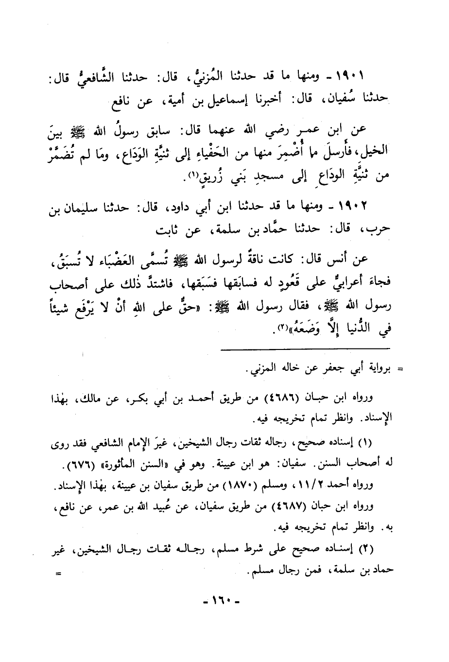 1901 - وَمِنْهَا مَا قَدْ حَدَّثَنَا الْمُزَنِيُّ قَالَ: حَدَّثَنَا الشَّافِعِيُّ قَالَ: ثنا سُفْيَانُ قَالَ: أَخْبَرَنَا إِسْمَاعِيلُ بْنُ أُمَيَّةَ , عَنْ نَافِعٍ , عَنِ ابْنِ عُمَرَ رَضِيَ اللهُ عَنْهُمَا قَالَ: سَابَقَ رَسُولُ اللهِ صَلَّى اللَّهُ عَلَيْهِ وَسَلَّمَ بَيْنَ الْخَيْلِ فَأَرْسَلَ مَا أُضْمِرَ مِنْهَا مِنَ الْحَفْيَاءِ إِلَى ثَنِيَّةِ الْوَدَاعِ وَمَا لَمْ تُضْمَرْ مِنْ ثَنِيَّةِ الْوَدَاعِ إِلَى مَسْجِدِ بَنِي زُرَيْقٍ
