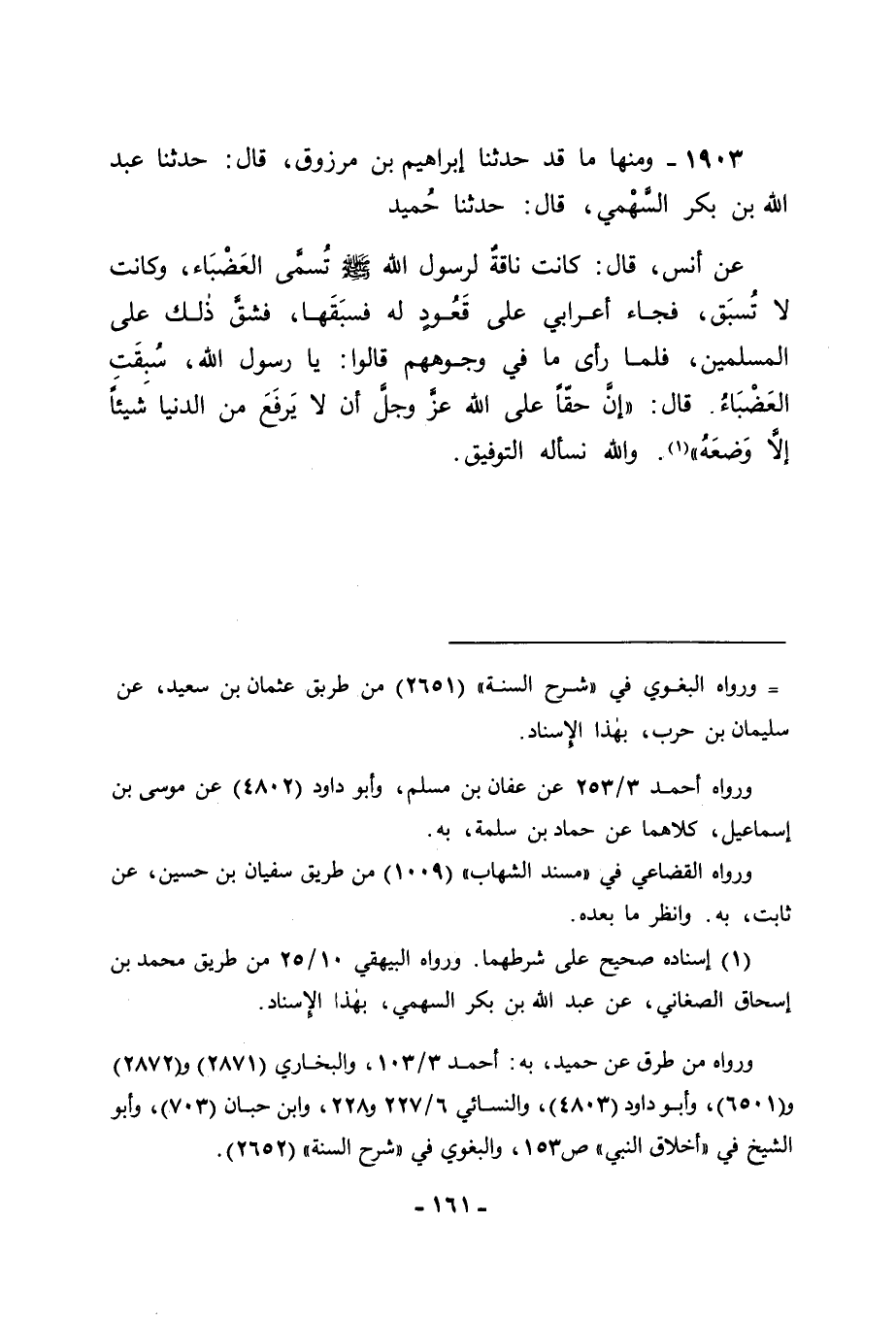 1903 - وَمِنْهَا مَا قَدْ حَدَّثَنَا إِبْرَاهِيمُ بْنُ مَرْزُوقٍ قَالَ: حَدَّثَنَا عَبْدُ اللهِ بْنُ بَكْرٍ السَّهْمِيُّ قَالَ: حَدَّثَنَا حُمَيْدٌ , عَنْ أَنَسٍ قَالَ: كَانَتْ نَاقَةٌ لِرَسُولِ اللهِ صَلَّى اللَّهُ عَلَيْهِ وَسَلَّمَ تُسَمَّى الْعَضْبَاءُ , وَكَانَتْ لَا تُسْبَقُ , فَجَاءَ أَعْرَابِيٌّ عَلَى قَعُودٍ لَهُ فَسَبَقَهَا , فَشَقَّ ذَلِكَ عَلَى الْمُسْلِمِينَ , قَالُوا: يَا رَسُولَ اللهِ سُبِقَتِ الْعَضْبَاءُ , فَلَمَّا رَأَى مَا فِي وُجُوهِهِمْ قَالَ: " إِنَّ حَقًّا عَلَى اللهِ عَزَّ وَجَلَّ أَنْ لَا يَرْفَعَ مِنَ الدُّنْيَا شَيْئًا إِلَّا وَضَعَهُ وَاللهَ نَسْأَلُهُ التَّوْفيِقَ.