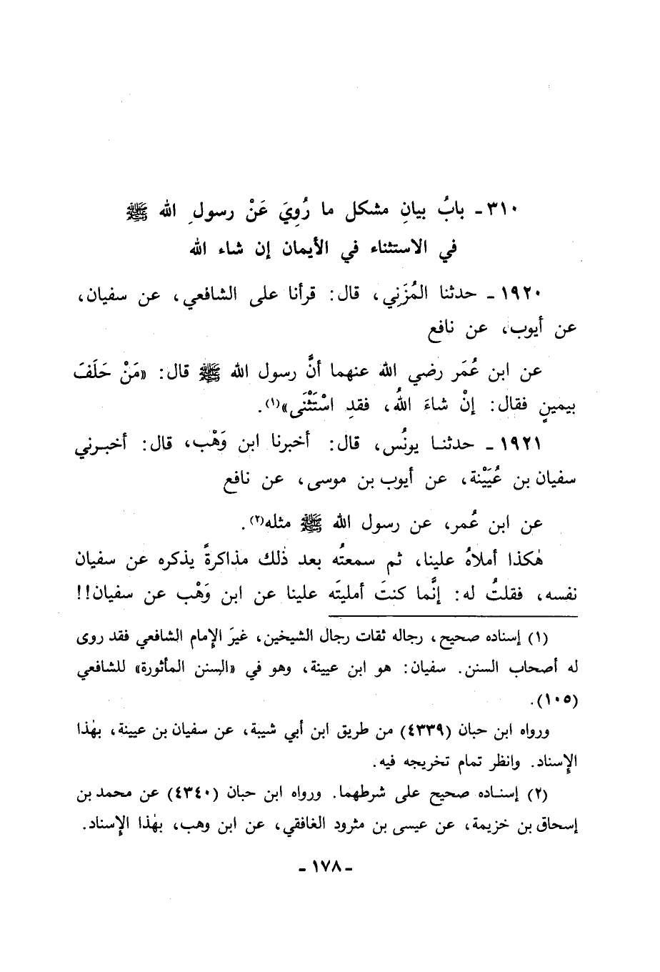 1920 - حَدَّثَنَا الْمُزَنِيُّ قَالَ: قَرَأْنَا عَلَى الشَّافِعِيِّ: عَنْ سُفْيَانَ , عَنْ أَيُّوبَ , عَنْ نَافِعٍ , عَنِ ابْنِ عُمَرَ رَضِيَ اللهُ عَنْهُمَا , أَنَّ رَسُولَ اللهِ صَلَّى اللَّهُ عَلَيْهِ وَسَلَّمَ قَالَ: " مَنْ حَلَفَ بِيَمِينٍ فَقَالَ: إِنْ شَاءَ اللهُ فَقَدِ اسْتَثْنَى ".
