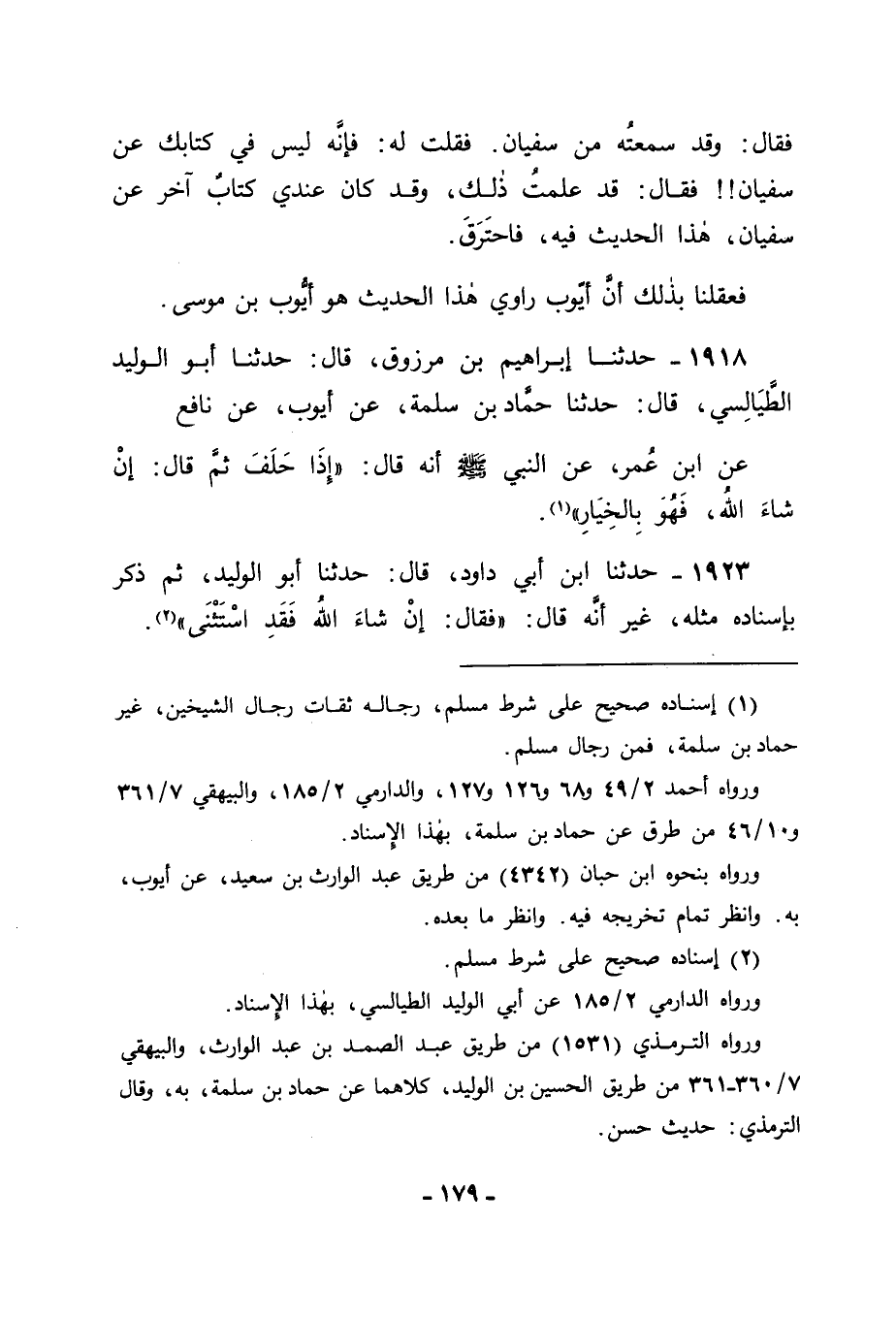 1922 - حَدَّثَنَا إِبْرَاهِيمُ بْنُ مَرْزُوقٍ قَالَ: حَدَّثَنَا أَبُو الْوَلِيدِ الطَّيَالِسِيُّ قَالَ: حَدَّثَنَا حَمَّادُ بْنُ سَلَمَةَ , عَنْ أَيُّوبَ , عَنْ نَافِعٍ , عَنِ ابْنِ عُمَرَ , عَنِ النَّبِيِّ صَلَّى اللَّهُ عَلَيْهِ وَسَلَّمَ أَنَّهُ قَالَ: " إِذَا حَلَفَ ثُمَّ قَالَ: إِنْ شَاءَ اللهُ , فَهُوَ بِالْخِيَارِ ".
