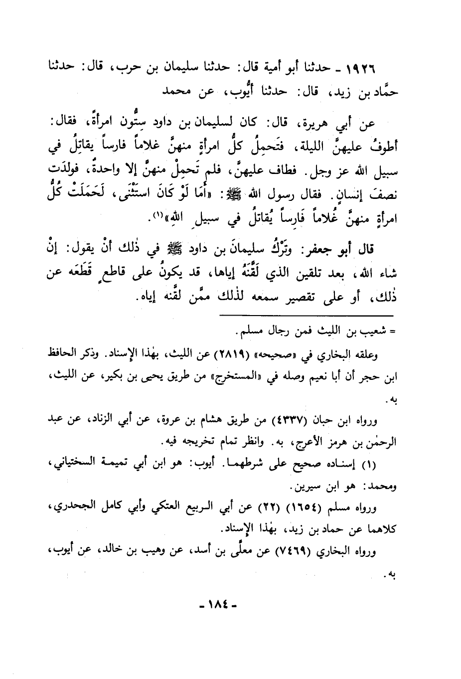 1926 - حَدَّثَنَا أَبُو أُمَيَّةَ قَالَ: حَدَّثَنَا سُلَيْمَانُ بْنُ حَرْبٍ قَالَ: حَدَّثَنَا حَمَّادُ بْنُ زَيْدٍ قَالَ: حَدَّثَنَا أَيُّوبُ , عَنْ مُحَمَّدٍ , عَنْ أَبِي هُرَيْرَةَ قَالَ كَانَ لِسُلَيْمَانَ بْنِ دَاوُدَ سِتُّونَ امْرَأَةً , فَقَالَ: أَطُوفُ عَلَيْهِنَّ اللَّيْلَةَ فَتَحْمِلُ كُلُّ امْرَأَةٍ مِنْهُنَّ غُلَامًا فَارِسًا يُقَاتِلُ فِي سَبِيلِ اللهِ عَزَّ وَجَلَّ , فَطَافَ عَلَيْهِنَّ فَلَمْ تَحْمِلْ مِنْهُنَّ إِلَّا وَاحِدَةٌ , فَوَلَدَتْ نِصْفَ إِنْسَانٍ , فَقَالَ رَسُولُ اللهِ صَلَّى اللَّهُ عَلَيْهِ وَسَلَّمَ: " أَمَا لَوْ كَانَ اسْتَثْنَى لَحَمَلَتْ كُلُّ امْرَأَةٍ مِنْهُنَّ غُلَامًا فَارِسًا , يُقَاتِلُ فِي سَبِيلِ اللهِ. قَالَ أَبُو جَعْفَرٍ: وَتَرْكُ سُلَيْمَانَ بْنِ دَاوُدَ صَلَّى اللَّهُ عَلَيْهِ وَسَلَّمَ فِي ذَلِكَ أَنْ يَقُولَ: إِنْ شَاءَ اللهُ , بَعْدَ تَلْقِينِ الَّذِي لَقَّنَهُ إِيَّاهَا قَدْ يَكُونُ عَلَى قَاطِعٍ قَطَعَهُ عَنْ ذَلِكَ , أَوْ عَلَى تَقْصِيرٍ سَمِعَهُ لِذَلِكَ مِمَّنْ لَقَّنَهُ إِيَّاهُ. -[185]- وَقَدْ رَوَى عَنْ رَسُولِ اللهِ صَلَّى اللَّهُ عَلَيْهِ وَسَلَّمَ فِي الِاسْتِثْنَاءِ فِي الْأَيْمَانِ أَبُو هُرَيْرَةَ , كَمَا رَوَاهُ عَنْهُ ابْنُ عُمَرَ