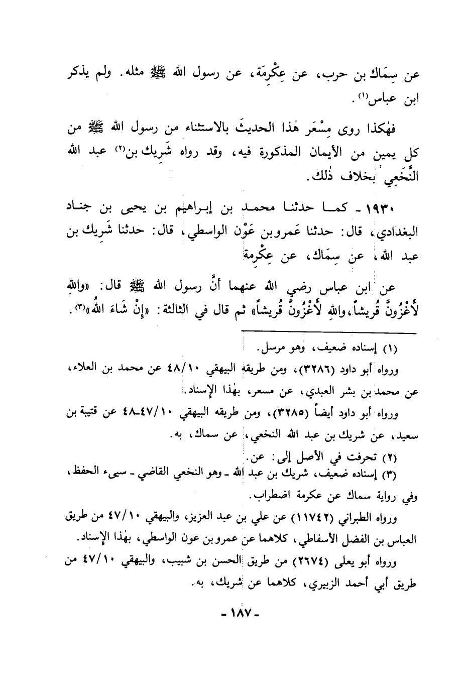1930 - كَمَا حَدَّثَنَا مُحَمَّدُ بْنُ إِبْرَاهِيمَ بْنِ يَحْيَى بْنِ جَنَّادٍ الْبَغْدَادِيُّ قَالَ: حَدَّثَنَا عَمْرُو بْنُ عَوْنٍ الْوَاسِطِيُّ قَالَ: حَدَّثَنَا شَرِيكُ بْنُ عَبْدِ اللهِ , عَنْ سِمَاكٍ , عَنْ عِكْرِمَةَ , عَنِ ابْنِ عَبَّاسٍ رَضِيَ اللهُ عَنْهُمَا: أَنَّ رَسُولَ اللهِ صَلَّى اللَّهُ عَلَيْهِ وَسَلَّمَ قَالَ: " وَاللهِ لَأَغْزُوَنَّ قُرَيْشًا , وَاللهِ لَأَغْزُوَنَّ قُرَيْشًا , ثُمَّ قَالَ فِي الثَّالِثَةِ: " إِنْ شَاءَ اللهُ "