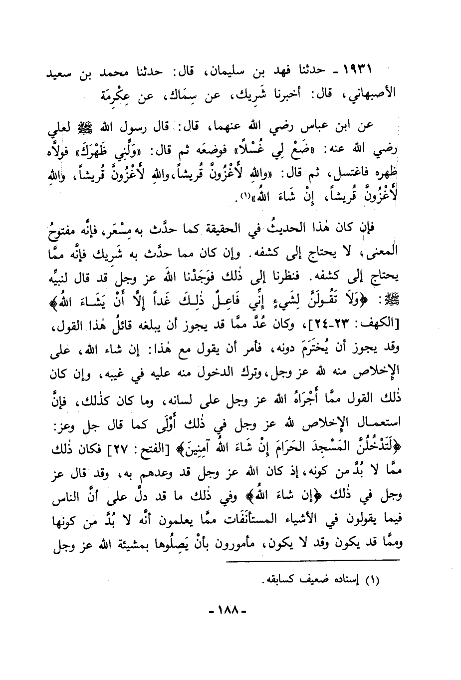 1931 - حَدَّثَنَا فَهْدُ بْنُ سُلَيْمَانَ قَالَ: حَدَّثَنَا مُحَمَّدُ بْنُ سَعِيدٍ الْأَصْبَهَانِيُّ قَالَ: أَخْبَرَنَا شَرِيكٌ , عَنْ سِمَاكٍ , عَنْ عِكْرِمَةَ , عَنِ ابْنِ عَبَّاسٍ رَضِيَ اللهُ عَنْهُمَا قَالَ: قَالَ رَسُولُ اللهِ صَلَّى اللَّهُ عَلَيْهِ وَسَلَّمَ لِعَلِيٍّ رَضِيَ اللهُ عَنْهُ: " ضَعْ لِي غُسْلًا " فَوَضَعَهُ ثُمَّ قَالَ: " وَلِّنِي ظَهْرَكَ " فَوَلَّاهُ ظَهْرَهُ , فَاغْتَسَلَ , ثُمَّ قَالَ: " وَاللهِ لَأَغْزُوَنَّ قُرَيْشًا , وَاللهِ لَأَغْزُوَنَّ قُرَيْشًا وَاللهِ لَأَغْزُوَنَّ قُرَيْشًا , إِنْ شَاءَ اللهُ ". فَإِنْ كَانَ هَذَا الْحَدِيثُ فِي الْحَقِيقَةِ كَمَا حَدَّثَ بِهِ مِسْعَرٌ فَإِنَّهُ مَفْتُوحُ الْمَعْنَى , لَا يُحْتَاجُ إِلَى كَشْفِهِ , وَإِنْ كَانَ مِمَّا حَدَّثَ بِهِ شَرِيكٌ فَإِنَّهُ مِمَّا يُحْتَاجُ إِلَى كَشْفِهِ , فَنَظَرْنَا إِلَى ذَلِكَ فَوَجَدْنَا اللهَ عَزَّ وَجَلَّ قَدْ قَالَ لِنَبِيِّهِ صَلَّى اللَّهُ عَلَيْهِ وَسَلَّمَ: {وَلَا تَقُولَنَّ لِشَيْءٍ إِنِّي فَاعِلٌ ذَلِكَ غَدًا إِلَّا أَنْ يَشَاءَ اللهُ} [الكهف: 24] وَكَانَ عُدَّ مِمَّا قَدْ يَجُوزُ أَنْ يَبْلُغَهُ قَائِلُ هَذَا الْقَوْلِ , وَقَدْ يَجُوزُ أَنْ يُخْتَرَمَ دُونَهُ , فَأُمِرَ أَنْ يَقُولَ مَعَ هَذَا: إِنْ شَاءَ اللهُ , عَلَى الْإِخْلَاصِ مِنْهُ لِلَّهِ عَزَّ وَجَلَّ , وَتَرْكِ الدُّخُولِ مِنْهُ عَلَيْهِ فِي غَيْبِهِ , وَإِنْ كَانَ ذَلِكَ الْقَوْلُ مِمَّا أَجْرَاهُ اللهُ عَزَّ وَجَلَّ عَلَى لِسَانِهِ , وَمَا كَانَ كَذَلِكَ فَإِنَّ اسْتِعْمَالَ الْإِخْلَاصِ لِلَّهِ عَزَّ وَجَلَّ فِي ذَلِكَ أَوْلَى , كَمَا قَالَ جَلَّ وَعَزَّ: {لَتَدْخُلُنَّ الْمَسْجِدَ الْحَرَامَ إِنْ شَاءَ اللهُ آمِنِينَ} [الفتح: 27] فَكَانَ ذَلِكَ مِمَّا لَا بُدَّ مِنْ كَوْنِهِ إِذْ كَانَ اللهُ عَزَّ وَجَلَّ قَدْ وَعَدَهُمْ بِهِ , وَقَدْ قَالَ عَزَّ وَجَلَّ فِي ذَلِكَ: {إِنْ شَاءَ اللهُ} [البقرة: 70] وَفِي ذَلِكَ مَا قَدْ دَلَّ عَلَى أَنَّ النَّاسَ فِيمَا يَقُولُونَ فِي الْأَشْيَاءِ الْمُسْتَأْنَفَاتِ مِمَّا يَعْلَمُونَ أَنَّهُ لَا بُدَّ مِنْ كَوْنِهَا وَمِمَّا قَدْ يَكُونُ وَقَدْ لَا يَكُونُ مَأْمُورُونَ بِأَنْ يَصِلُوهَا بِمَشِيئَةِ اللهِ عَزَّ وَجَلَّ -[189]- إِيَّاهَا إِخْلَاصًا لَهُ عَزَّ وَجَلَّ , وَتَسْلِيمًا لِلْأُمُورِ إِلَيْهِ , وَكَذَلِكَ الْأُمُورُ كُلُّهَا , فَيَنْبَغِي لِلْحَالِفِينَ بِهَا إِذَا كَانَتْ عَلَى الْأَشْيَاءِ الْمُسْتَأْنَفَاتِ أَنْ يَصِلُوهَا بِإِنْ شَاءَ اللهُ. فَإِنْ قَالَ قَائِلٌ: فَقَدْ كَانَ مِنْ النَّبِيِّ صَلَّى اللَّهُ عَلَيْهِ وَسَلَّمَ الْإِيلَاءُ مِنْ نِسَائِهِ بِغَيْرِ قَوْلٍ مِنْهُ فِيهِ: إِنْ شَاءَ اللهُ , حَتَّى كَانَ بِذَلِكَ مُولِيًا مِنْهُمْ. قِيلَ لَهُ: قَدْ يُحْتَمَلُ أَنَّ ذَلِكَ مِنْهُ صَلَّى اللَّهُ عَلَيْهِ وَسَلَّمَ قَبْلَ إِنْزَالِ اللهِ عَزَّ وَجَلَّ عَلَيْهِ: {وَلَا تَقُولَنَّ لِشَيْءٍ إِنِّي فَاعِلٌ ذَلِكَ غَدًا إِلَّا أَنْ يَشَاءَ اللهُ} [الكهف: 23] , وَاللهَ تَعَالَى نَسْأَلُهُ التَّوْفِيقَ