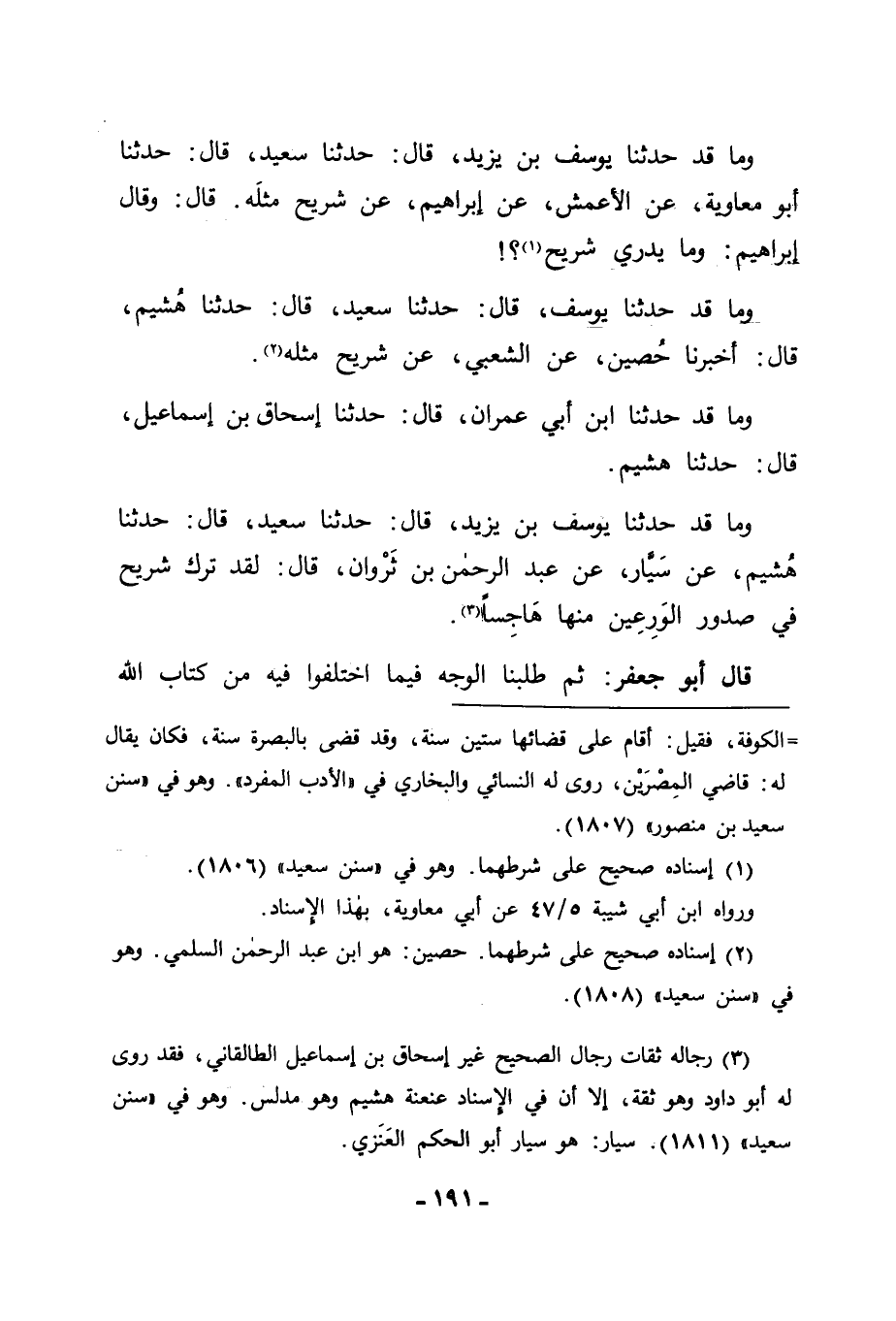 وَمَا قَدْ حَدَّثَنَا يُوسُفُ بْنُ يَزِيدَ قَالَ: حَدَّثَنَا سَعِيدٌ قَالَ: ثنا أَبُو مُعَاوِيَةَ , عَنِ الْأَعْمَشِ , عَنْ إِبْرَاهِيمَ , عَنْ شُرَيْحٍ مِثْلَهُ قَالَ: وَقَالَ إِبْرَاهِيمُ: وَمَا يَدْرِي شُرَيْحٌ. وَمَا قَدْ حَدَّثَنَا يُوسُفُ قَالَ: حَدَّثَنَا سَعِيدٌ قَالَ: حَدَّثَنَا هُشَيْمٌ قَالَ: أَخْبَرَنَا حُصَيْنٌ , عَنِ الشَّعْبِيِّ , عَنْ شُرَيْحٍ مِثْلَهُ. وَمَا قَدْ حَدَّثَنَا ابْنُ أَبِي عِمْرَانَ قَالَ: حَدَّثَنَا إِسْحَاقُ بْنُ إِسْمَاعِيلَ قَالَ: ثنا هُشَيْمٌ. وَمَا قَدْ حَدَّثَنَا يُوسُفُ بْنُ يَزِيدَ قَالَ: حَدَّثَنَا سَعِيدٌ قَالَ: حَدَّثَنَا هُشَيْمٌ , عَنْ سَيَّارٍ , عَنْ عَبْدِ الرَّحْمَنِ بْنِ ثَرْوَانَ قَالَ: لَقَدْ تَرَكَ شُرَيْحٌ فِي صُدُورِ الْوَرِعِينَ مِنْهَا هَاجِسًا. قَالَ أَبُو جَعْفَرٍ: ثُمَّ طَلَبْنَا الْوَجْهَ فِيمَا اخْتَلَفُوا فِيهِ مِنْ كِتَابِ اللهِ ,