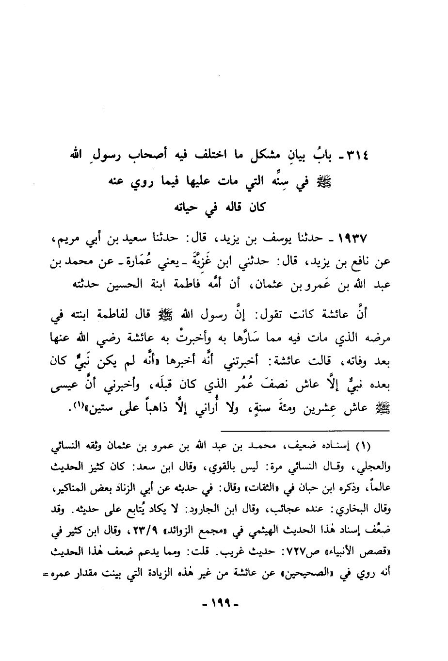 1937 - حَدَّثَنَا يُوسُفُ بْنُ يَزِيدَ قَالَ: حَدَّثَنَا سَعِيدُ بْنُ أَبِي مَرْيَمَ , عَنْ نَافِعِ بْنِ يَزِيدَ قَالَ: حَدَّثَنِي ابْنُ غَزِيَّةَ يَعْنِي عُمَارَةَ , عَنْ مُحَمَّدِ بْنِ عَبْدِ اللهِ بْنِ عَمْرِو بْنِ عُثْمَانَ , أَنَّ أُمَّهُ فَاطِمَةَ ابْنَةَ الْحُسَيْنِ حَدَّثَتْهُ , أَنَّ عَائِشَةَ كَانَتْ تَقُولُ: إِنَّ رَسُولَ اللهِ صَلَّى اللَّهُ عَلَيْهِ وَسَلَّمَ قَالَ لِفَاطِمَةَ ابْنَتِهِ فِي مَرَضِهِ الَّذِي مَاتَ فِيهِ مِمَّا سَارَّهَا بِهِ وَأَخْبَرَتْ بِهِ عَائِشَةَ رَضِيَ اللهُ عَنْهَا بَعْدَ وَفَاتِهِ , قَالَتْ عَائِشَةُ: أَخْبَرَتْنِي أَنَّهُ أَخْبَرَهَا " أَنَّهُ لَمْ يَكُنْ نَبِيٌّ كَانَ بَعْدَهُ نَبِيٌّ إِلَّا عَاشَ نِصْفَ عُمْرِ الَّذِي كَانَ قَبْلَهُ , وَأَخْبَرَنِي أَنَّ عِيسَى صَلَّى اللَّهُ عَلَيْهِ وَسَلَّمَ عَاشَ عِشْرِينَ وَمِائَةَ سَنَةٍ , وَلَا أُرَانِي إِلَّا ذَاهِبًا عَلَى سِتِّينَ "