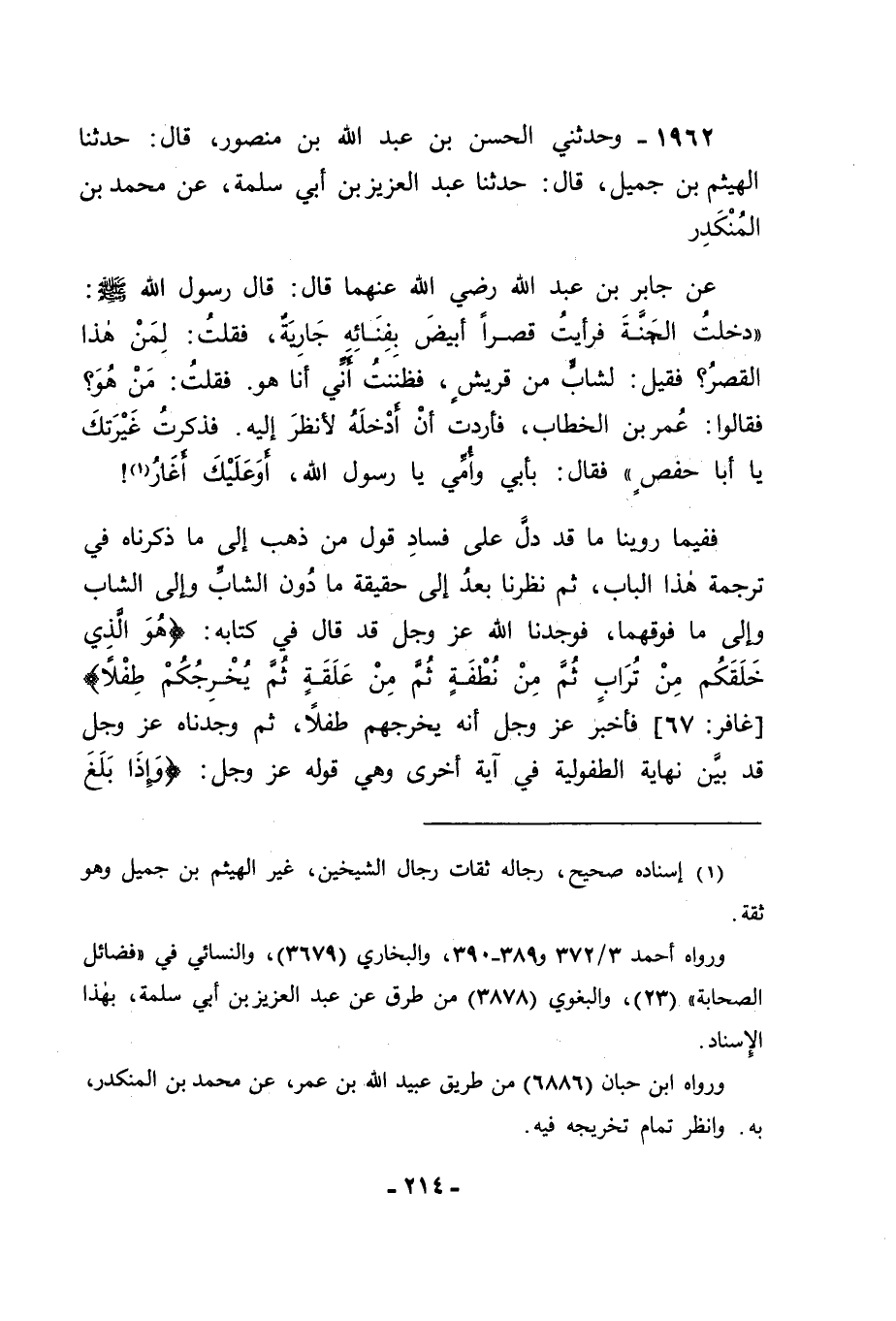 1962 - وَحَدَّثَنِي الْحَسَنُ بْنُ عَبْدِ اللهِ بْنِ مَنْصُورٍ قَالَ: حَدَّثَنَا الْهَيْثَمُ بْنُ جَمِيلٍ قَالَ: حَدَّثَنَا عَبْدُ الْعَزِيزِ بْنُ أَبِي سَلَمَةَ , عَنْ مُحَمَّدِ بْنِ الْمُنْكَدِرِ , عَنْ جَابِرِ بْنِ عَبْدِ اللهِ رَضِيَ اللهُ عَنْهُمَا قَالَ: قَالَ النَّبِيُّ صَلَّى اللَّهُ عَلَيْهِ وَسَلَّمَ: " دَخَلْتُ الْجَنَّةَ فَرَأَيْتُ قَصْرًا أَبْيَضَ بِفِنَائِهِ جَارِيَةٌ , فَقُلْتُ: لِمَنْ هَذَا الْقَصْرُ؟ فَقِيلَ: لِشَابٍّ مِنْ قُرَيْشٍ , فَظَنَنْتُ أَنِّي أَنَا هُوَ , فَقُلْتُ: مَنْ هُوَ؟ فَقَالُوا: عُمَرُ بْنُ الْخَطَّابِ , فَأَرَدْتُ أَنْ أَدْخُلَهُ لِأَنْظُرَ إِلَيْهِ , فَذَكَرْتُ غَيْرَتَكَ يَا أَبَا حَفْصٍ " فَقَالَ: بِأَبِي وَأُمِّي يَا رَسُولَ اللهِ , أَوَعَلَيْكَ أَغَارُ؟ فَفِيمَا رَوَيْنَا مَا قَدْ دَلَّ عَلَى فَسَادِ قَوْلِ مَنْ ذَهَبَ إِلَى مَا ذَكَرْنَاهُ فِي تَرْجَمَةِ هَذَا الْبَابِ , ثُمَّ نَظَرْنَا بَعْدُ إِلَى حَقِيقَةِ مَا دُونَ الشَّابِ , وَإِلَى الشَّابِّ , وَإِلَى مَا فَوْقَهُمَا , فَوَجَدْنَا اللهَ عَزَّ وَجَلَّ قَدْ قَالَ فِي كِتَابِهِ: {هُوَ الَّذِي خَلَقَكُمْ مِنْ تُرَابٍ ثُمَّ مِنْ نُطْفَةٍ ثُمَّ مِنْ عَلَقَةٍ ثُمَّ يُخْرِجُكُمْ طِفْلًا} [غافر: 67] فَأَخْبَرَ عَزَّ وَجَلَّ أَنَّهُ يُخْرِجُهُمْ طِفْلًا , ثُمَّ وَجَدْنَاهُ عَزَّ وَجَلَّ قَدْ بَيَّنَ نِهَايَةَ الطُّفُولِيَّةِ فِي آيَةٍ أُخْرَى وَهِيَ قَوْلُهُ عَزَّ وَجَلَّ: {وَإِذَا بَلَغَ -[215]- الْأَطْفَالُ مِنْكُمُ الْحُلُمَ فَلْيَسْتَأْذِنُوا كَمَا اسْتَأْذَنَ الَّذِينَ مِنْ قَبْلِهِمْ} [النور: 59] فَعَقَلْنَا بِذَلِكَ أَنَّ مَا دُونَ بُلُوغِ الْحُلُمِ حَالُ طُفُولِيَّةٍ , وَأَنَّ مَا بَعْدَ الْحُلُمِ ضِدٌّ لَهَا , وَلَا شَيْءَ نَعْلَمُهُ يَكُونُ تَالِيًا لِلطُّفُولِيَّةِ غَيْرَ الشَّبَابِ , فَعَقَلْنَا بِذَلِكَ أَنَّ مَنِ احْتَلَمَ شَابٌّ , ثُمَّ يَكُونُ كَذَلِكَ إِلَى مَا شَاءَ اللهُ أَنْ يَكُونَ , وَطَلَبْنَا الْمُدَّةَ الَّتِي يَكُونُ فِيهَا كَذَلِكَ ثُمَّ يَخْرُجُ مِنْهَا إِلَى ضِدِّهَا فَوَجَدْنَا اللهَ قَدْ قَالَ فِي الْآيَةِ الَّتِي بَدَأْنَا بِتِلَاوَتِهَا فِي هَذَا الْبَابِ: {ثُمَّ لِتَبْلُغُوا أَشُدَّكُمْ} [غافر: 67] وَلَمْ يُبَيِّنَ لَنَا عَزَّ وَجَلَّ فِيهَا مَا بُلُوغُ الْأَشُدِّ , ثُمَّ وَجَدْنَاهُ عَزَّ وَجَلَّ قَدْ بَيَّنَ ذَلِكَ لَنَا فِي آيَةٍ أُخْرَى بِقَوْلِهِ: {حَتَّى إِذَا بَلَغَ أَشُدَّهُ} [الأحقاف: 15] وَاحْتَجْنَا أَنْ نَعْلَمَ: هَلْ خَرَجَ بِذَلِكَ مِنَ الشَّبَابِ إِلَى غَيْرِهِ أَمْ لَا؟ فَوَجَدْنَاهُ عَزَّ وَجَلَّ قَدْ بَيَّنَ لَنَا ذَلِكَ فِي آيَةٍ أُخْرَى بِقَوْلِهِ: {حَتَّى إِذَا بَلَغَ أَشُدَّهُ وَبَلَغَ أَرْبَعِينَ سَنَةً} [الأحقاف: 15] فَعَقَلْنَا بِذَلِكَ أَنَّ مَنْ بَلَغَ الْأَرْبَعِينَ سَنَةً فَقَدْ بَلَغَ أَشُدَّهُ , وَاحْتَجْنَا أَنْ نَعْلَمَ: هَلْ خَرَجَ بِذَلِكَ مِنَ الشَّبَابِ إِلَى غَيْرِهِ أَمْ لَا؟ فَوَجَدْنَا اللهَ عَزَّ وَجَلَّ قَدْ قَالَ فِي الَّتِي بَدَأْنَا بِتِلَاوَتِهَا بِعَقِبِ قَوْلِهِ فِيهَا: {ثُمَّ لِتَبْلُغُوا أَشُدَّكُمْ ثُمَّ لِتَكُونُوا شُيُوخًا} [غافر: 67] فَاحْتَمَلَ أَنْ يَكُونَ مَا بَعْدَ الْأَرْبَعِينَ خُرُوجًا مِنَ الشَّبَابِ وَدُخُولًا فِي الشَّيْخُوخَةِ , فَوَجَدْنَا اللهَ عَزَّ وَجَلَّ قَدْ قَالَ فِيهَا: {هُوَ الَّذِي خَلَقَكُمْ مِنْ تُرَابٍ ثُمَّ مِنْ نُطْفَةٍ} [غافر: 67] فَكَانَ بَيْنَ الْخَلْقِ مِنَ التُّرَابِ وَبَيْنَ الْخَلْقِ مِنَ النُّطْفَةِ فَاصِلٌ؛ لِأَنَّ الْمَخْلُوقَ مِنَ التُّرَابِ هُوَ آدَمُ صَلَّى اللَّهُ عَلَيْهِ وَسَلَّمَ , وَالْمَخْلُوقِينَ مِنَ النُّطْفَةِ هُمْ بَنُوهُ , وَبَيْنَ الْخَلْقَيْنِ مِنَ الزَّمَانِ مَا شَاءَ اللهُ أَنْ 