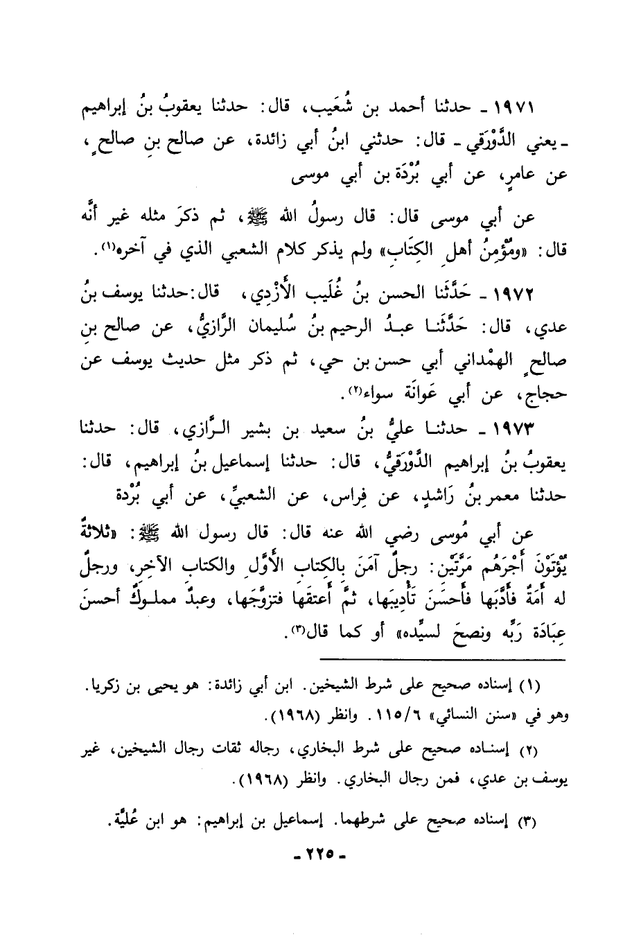 1973 - حَدَّثَنَا عَلِيُّ بْنُ سَعِيدِ بْنِ بَشِيرٍ الرَّازِيُّ قَالَ: حَدَّثَنَا يَعْقُوبُ بْنُ إِبْرَاهِيمَ الدَّوْرَقِيُّ قَالَ: حَدَّثَنَا إِسْمَاعِيلُ بْنُ إِبْرَاهِيمَ قَالَ: حَدَّثَنَا مَعْمَرُ بْنُ رَاشِدٍ , عَنْ فِرَاسٍ , عَنِ الشَّعْبِيِّ , عَنْ أَبِي بُرْدَةَ , عَنْ أَبِي مُوسَى رَضِيَ اللهُ عَنْهُ قَالَ: قَالَ رَسُولُ اللهِ صَلَّى اللَّهُ عَلَيْهِ وَسَلَّمَ: " ثَلَاثَةٌ يُؤْتَوْنَ أَجْرَهُمْ مَرَّتَيْنِ: رَجُلٌ آمَنَ بِالْكِتَابِ الْأَوَّلِ وَالْكِتَابِ الْآخِرِ , وَرَجُلٌ لَهُ أَمَةٌ فَأَدَّبَهَا فَأَحْسَنَ تَأْدِيبَهَا , ثُمَّ أَعْتَقَهَا فَتَزَوَّجَهَا , وَعَبْدٌ مَمْلُوكٌ أَحْسَنَ عِبَادَةَ رَبِّهِ , وَنَصَحَ لِسَيِّدِهِ ". أَوْ كَمَا قَالَ. -[226]-