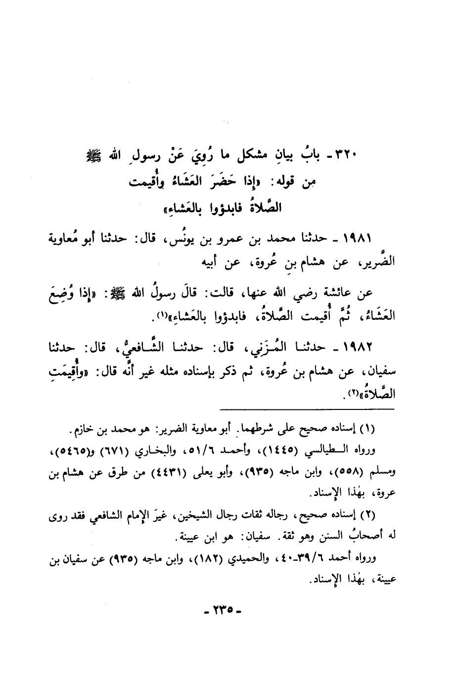 1982 - حَدَّثَنَا الْمُزَنِيُّ قَالَ: حَدَّثَنَا الشَّافِعِيُّ قَالَ: حَدَّثَنَا سُفْيَانُ , عَنْ هِشَامِ بْنِ عُرْوَةَ , ثُمَّ ذَكَرَ بِإِسْنَادِهِ مِثْلَهُ , غَيْرَ أَنَّهُ قَالَ: " وَأُقِيمَتِ الصَّلَاةُ ". -[236]-