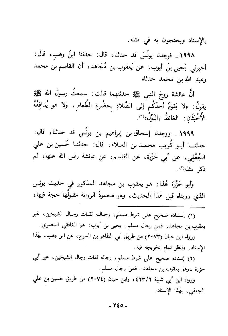 1999 - وَوَجَدْنَا إِسْحَاقَ بْنَ إِبْرَاهِيمَ بْنِ يُونُسَ قَدْ حَدَّثَنَا قَالَ: حَدَّثَنَا أَبُو كُرَيْبٍ مُحَمَّدُ بْنُ الْعَلَاءِ قَالَ: حَدَّثَنَا حُسَيْنُ بْنُ عَلِيٍّ الْجُعْفِيُّ , عَنْ أَبِي حَزْرَةَ , عَنِ الْقَاسِمِ , عَنْ عَائِشَةَ رَضِيَ اللهُ عَنْهَا , ثُمَّ ذَكَرَ مِثْلَهُ. وَأَبُو حَزْرَةَ هَذَا هُوَ يَعْقُوبُ بْنُ مُجَاهِدٍ الْمَذْكُورُ فِي حَدِيثِ يُونُسَ الَّذِي رَوَيْنَاهُ قَبْلَ هَذَا الْحَدِيثِ , وَهُوَ مَحْمُودُ الرِّوَايَةِ مَقْبُولُهَا , حُجَّةٌ فِيهَا , -[246]- قَدْ حَدَّثَ عَنْهُ غَيْرُ وَاحِدٍ مِنَ الْأَئِمَّةِ. مِنْهُمْ: يَحْيَى الْقَطَّانُ وَمِنْهُمْ حُسَيْنٌ الْجُعْفِيُّ وَمِنْهُمْ حَاتِمُ بْنُ إِسْمَاعِيلَ , وَمِنْهُمْ عَبْدُ اللهِ بْنُ مُحَمَّدٍ الْمَذْكُورُ فِي حَدِيثِ يُونُسَ , عَنِ ابْنِ وَهْبٍ , عَنْ يَحْيَى بْنِ أَيُّوبَ هُوَ عَبْدُ اللهِ بْنُ مُحَمَّدِ بْنِ أَبِي بَكْرٍ الصِّدِّيقُ رَضِيَ اللهُ عَنْهُ , أَخُو الْقَاسِمِ بْنِ مُحَمَّدٍ