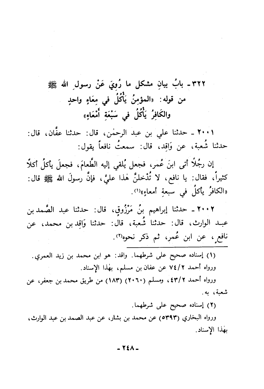 2001 - حَدَّثَنَا عَلِيُّ بْنُ عَبْدِ الرَّحْمَنِ قَالَ: حَدَّثَنَا عَفَّانَ قَالَ: حَدَّثَنَا شُعْبَةُ , عَنْ وَاقِدٍ قَالَ: سَمِعْتُ نَافِعًا يَقُولُ: إِنَّ رَجُلًا أَتَى ابْنَ عُمَرَ , فَجَعَلَ يُلْقِي إِلَيْهِ الطَّعَامَ فَجَعَلَ يَأْكُلُ أَكْلًا كَثِيرًا , فَقَالَ: يَا نَافِعُ , لَا تُدْخِلَنَّ هَذَا عَلَيَّ , فَإِنَّ رَسُولَ اللهِ صَلَّى اللَّهُ عَلَيْهِ وَسَلَّمَ قَالَ: " الْكَافِرُ يَأْكُلُ فِي سَبْعَةِ أَمْعَاءٍ ".