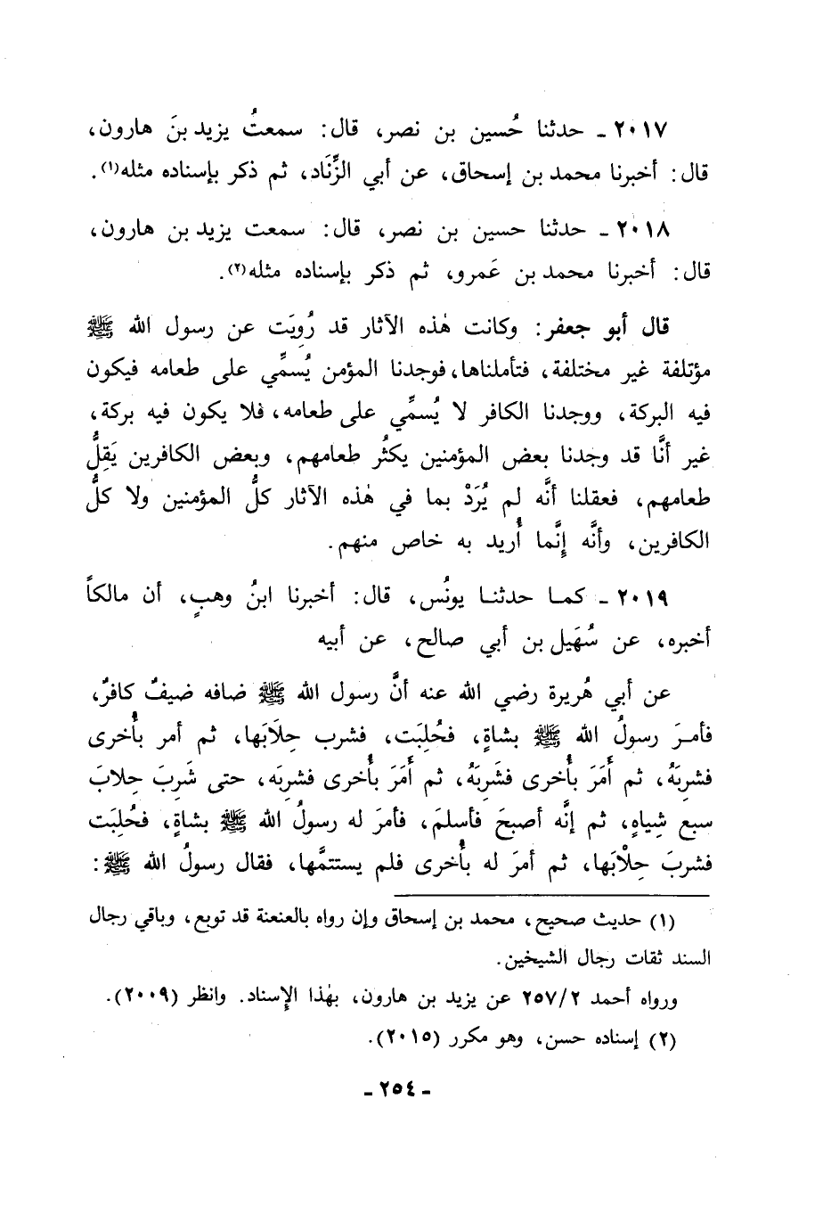 2019 - كَمَا حَدَّثَنَا يُونُسُ قَالَ: أَخْبَرَنَا ابْنُ وَهْبٍ , أَنَّ مَالِكًا , أَخْبَرَهُ , عَنْ سُهَيْلِ بْنِ أَبِي صَالِحٍ , عَنْ أَبِيهِ , عَنْ أَبِي هُرَيْرَةَ رَضِيَ اللهُ عَنْهُ: أَنَّ رَسُولَ اللهِ صَلَّى اللَّهُ عَلَيْهِ وَسَلَّمَ ضَافَهُ ضَيْفٌ كَافِرٌ , فَأَمَرَ رَسُولُ اللهِ صَلَّى اللَّهُ عَلَيْهِ وَسَلَّمَ بِشَاةٍ فَحُلِبَتْ فَشَرِبَ حِلَابَهَا , ثُمَّ أَمَرَ بِأُخْرَى فَشَرِبَهُ , ثُمَّ أَمَرَ بِأُخْرَى فَشَرِبَهُ , ثُمَّ أَمَرَ بِأُخْرَى فَشَرِبَهُ , حَتَّى شَرِبَ حِلَابَ سَبْعِ شِيَاهٍ , ثُمَّ إِنَّهُ أَصْبَحَ فَأَسْلَمَ , فَأَمَرَ لَهُ رَسُولُ اللهِ صَلَّى اللَّهُ عَلَيْهِ وَسَلَّمَ بِشَاةٍ فَحُلِبَتْ فَشَرِبَ حِلَابَهَا , ثُمَّ أَمَرَ بِأُخْرَى فَلَمْ يَسْتَتِمَّهَا , فَقَالَ رَسُولُ اللهِ صَلَّى اللَّهُ عَلَيْهِ وَسَلَّمَ: " -[255]- الْمُؤْمِنُ يَشْرَبُ فِي مِعًى وَاحِدٍ , وَالْكَافِرُ فِي سَبْعَةِ أَمْعَاءٍ ".