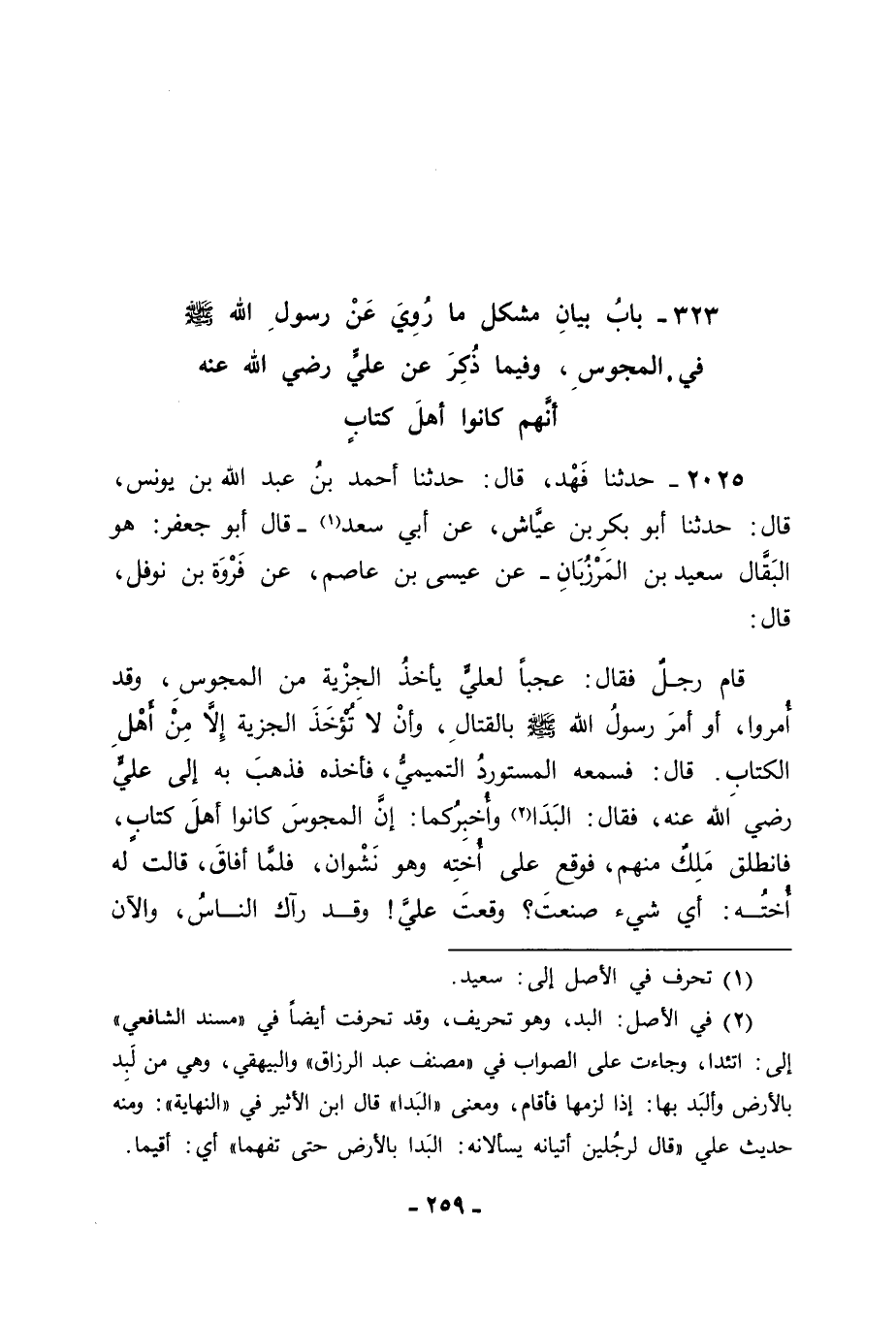 2025 - حَدَّثَنَا فَهْدٌ قَالَ: حَدَّثَنَا أَحْمَدُ بْنُ عَبْدِ اللهِ بْنِ يُونُسَ قَالَ: حَدَّثَنَا أَبُو بَكْرِ بْنُ عَيَّاشٍ , عَنْ أَبِي سَعْدٍ - قَالَ أَبُو جَعْفَرٍ: هُوَ الْبَقَّالُ سَعِيدُ بْنُ الْمَرْزُبَانِ - , عَنْ عِيسَى بْنِ عَاصِمٍ , عَنْ فَرْوَةَ بْنِ نَوْفَلٍ قَالَ: قَامَ رَجُلٌ فَقَالَ: عَجَبًا لِعَلِيٍّ , يَأْخُذُ الْجِزْيَةَ مِنَ الْمَجُوسِ وَقَدْ أُمِرُوا , أَوْ أَمَرَ رَسُولُ اللهِ صَلَّى اللَّهُ عَلَيْهِ وَسَلَّمَ بِالْقِتَالِ , وَأَنْ لَا تُؤْخَذَ الْجِزْيَةُ إِلَّا مِنْ أَهْلِ الْكِتَابِ , قَالَ: فَسَمِعَهُ الْمُسْتَوْرِدُ التَّمِيمِيُّ فَأَخَذَهُ فَذَهَبَ بِهِ إِلَى عَلِيٍّ رَضِيَ اللهُ عَنْهُ , فَقَالَ: الْبَدَا وَأُخْبِرُكُمَا: إِنَّ الْمَجُوسَ كَانُوا أَهْلَ كِتَابٍ , فَانْطَلَقَ مَلِكٌ مِنْهُمْ فَوَقَعَ عَلَى أُخْتِهِ وَهُوَ نَشْوَانُ , فَلَمَّا أَفَاقَ قَالَتْ لَهُ أُخْتُهُ: أَيَّ شَيْءٍ صَنَعْتَ؟ وَقَعْتَ عَلَيَّ وَقَدْ رَآكَ النَّاسُ , وَالْآنَ -[260]- يَرْجُمُونَكَ , قَالَ: أَوَلَا حَجَزْتِينِي؟ قَالَتْ: وَاسْتَطَعْتُ , جِئْتَ مِثْلَ الشَّيْطَانِ , وَلَقَدْ رَآكَ النَّاسُ , وَلَيَرْجُمُنَّكَ غَدًا إِلَّا أَنْ تُطِيعَنِي , قَالَ: وَكَيْفَ أَصْنَعُ؟ قَالَتْ: تُرْضِي أَهْلَ الطَّمَعِ , ثُمَّ تَدْعُو النَّاسَ فَتَقُولَ لَهُمْ: إِنَّ آدَمَ خَلَقَهُ اللهُ عَزَّ وَجَلَّ فَكَانَ يُزَوِّجُ ابْنَهُ أُخْتَهُ , أَوْ قَالَتِ: ابْنَهُ ابْنَتَهُ , قَالَ: وَجَاءَهُ الْقُرَّاءُ قَالُوا: قُمْ يَا عَدُوَّ اللهِ , قَالَ: هُوَ هَذَا فَقَدْ جَاءُوا , فَقَامَ إِلَيْهِمْ هَؤُلَائِكَ فَدَاسُوهُمْ حَتَّى مَاتُوا , فَمِنْ يَوْمِئِذٍ كَانَتِ الْمَجُوسِيَّةُ , وَقَدْ أَخَذَ رَسُولُ اللهِ صَلَّى اللَّهُ عَلَيْهِ وَسَلَّمَ الْجِزْيَةَ مِنْ مَجُوسِ هَجَرَ قَالَ أَبُو جَعْفَرٍ: فَكَانَ فِي هَذَا الْحَدِيثِ مِنْ قَوْلِ عَلِيٍّ رَضِيَ اللهُ عَنْهُ: إِنَّ الْمَجُوسَ كَانُوا أَهْلَ كِتَابٍ , وَكَانَ هَذَا عِنْدَنَا - وَاللهُ أَعْلَمُ - مِمَّا قَدْ يَحْتَمِلُ أَنْ يَكُونَ كَانُوا أَهْلَ كِتَابٍ , لَوْ بَقِيَ لَهُمْ لَأُكِلَتْ ذَبَائِحُهُمْ , وَلَحَلَّ نِسَاؤُهُمْ , وَلَكَانُوا فِي ذَلِكَ كَالْيَهُودِ وَكَالنَّصَارَى الَّذِينَ نُؤْمِنُ بِكِتَابَيْهِمْ , وَهُمَا التَّوْرَاةُ وَالْإِنْجِيلُ , وَلَكِنَّ اللهَ نَسَخَهُ -[261]- فَأَخْرَجَهُ مِنْ كُتُبِهِ , وَرَفَعَ حُكْمَهُ عَنْ أَهْلِ الْإِيمَانِ بِهِ , كَمَا نَسَخَ غَيْرَ شَيْءٍ مِمَّا قَدْ كَانَ أَنْزَلَهُ عَلَى نَبِيِّنَا صَلَّى اللَّهُ عَلَيْهِ وَسَلَّمَ قُرْآنًا فَأَعَادَهُ غَيْرَ قُرْآنٍ , مِنْ ذَلِكَ مَا كَانَ قَدْ يُقْرَأُ: " الشَّيْخُ وَالشَّيْخَةُ إِذَا زَنَيَا فَارْجُمُوهُمَا أَلْبَتَّةَ لِمَا قَضَيَا مِنَ اللَّذَّةِ " وَمِنْ ذَلِكَ: " لَوْ أَنَّ لِابْنِ آدَمَ وَادِيَيْنِ مِنْ مَالٍ لَابْتَغَى إِلَيْهِمَا ثَالِثًا " فِي أَشْيَاءَ كَثِيرَةٍ قَدْ نَسَخَهَا اللهُ عَزَّ وَجَلَّ , وَأَخْرَجَهَا أَنْ تَكُونَ قُرْآنًا , وَسَنَذْكُرُ مَا قَدْ رُوِيَ فِي ذَلِكَ فِيمَا بَعْدُ مِنْ كِتَابِنَا هَذَا , إِنْ شَاءَ اللهُ. وَلَمَّا كَانَ ذَلِكَ احْتَمَلَ أَنْ يَكُونَ مَا قَدْ رُوِيَ عَنْ عَلِيٍّ رَضِيَ اللهُ عَنْهُ فِي الْمَجُوسِ أَنَّهُمْ كَانَ لَهُمْ كِتَابٌ أَنْ يَكُونَ كَمَا رُوِيَ عَنْهُ فَنُسِخَ , فَخَرَجَ مِنْ كُتُبِ اللهِ عَزَّ وَجَلَّ فَلَمْ يَكُنْ مِنْهَا. فَقَالَ قَائِلٌ: فَكَيْفَ أُخِذَتْ مِنْهُمُ الْجِزْيَةُ , وَإِنَّمَا قَالَ اللهُ عَزَّ وَجَلَّ: {قَاتِلُوا الَّذِينَ لَا يُؤْمِنُونَ بِاللهِ وَلَا بِالْيَوْمِ الْآخِرِ وَلَا يُحَرِّمُونَ مَا حَرَّمَ اللهُ وَرَسُولُهُ وَلَا يَدِينُونَ دِينَ الْحَقِّ مِنَ الَّذِينَ أُوتُوا الْكِتَابَ حَتَّى يُعْطُوا الْجِزْيَ