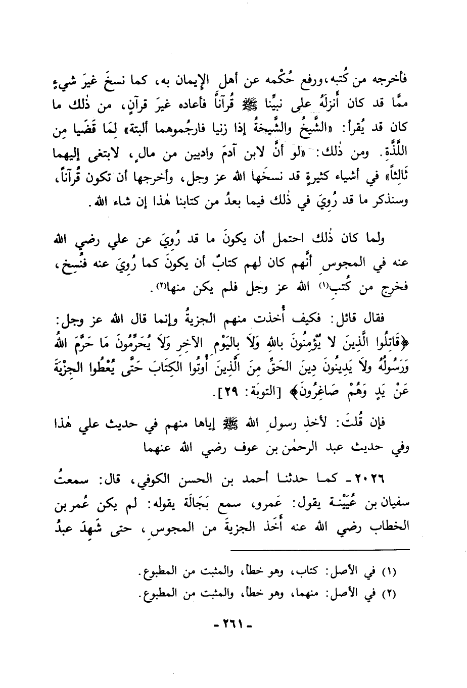 2026 - كَمَا حَدَّثَنَا أَحْمَدُ بْنُ الْحَسَنِ الْكُوفِيُّ قَالَ: سَمِعْتُ سُفْيَانَ بْنَ عُيَيْنَةَ يَقُولُ: عَمْرٌو سَمِعَ بَجَالَةَ يَقُولُهُ: لَمْ يَكُنْ عُمَرُ بْنُ الْخَطَّابِ رَضِيَ اللهُ عَنْهُ أَخَذَ الْجِزْيَةَ مِنَ الْمَجُوسِ حَتَّى شَهِدَ عَبْدُ -[262]- الرَّحْمَنِ بْنُ عَوْفٍ أَنَّ النَّبِيَّ صَلَّى اللَّهُ عَلَيْهِ وَسَلَّمَ أَخَذَهَا مِنْ أَهْلِ هَجَرَ. وَفِي حَدِيثِ عَمْرِو بْنِ عَوْفٍ