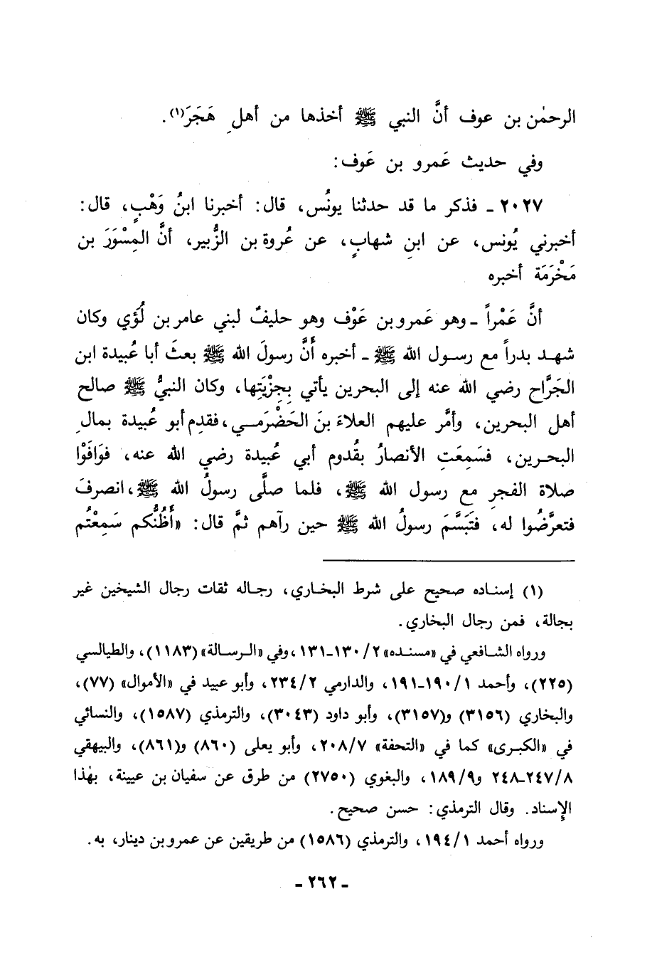 2027 - فَذَكَرَ مَا قَدْ حَدَّثَنَا يُونُسُ قَالَ: أَخْبَرَنَا ابْنُ وَهْبٍ قَالَ: أَخْبَرَنِي يُونُسُ , عَنِ ابْنِ شِهَابٍ , عَنْ عُرْوَةَ بْنِ الزُّبَيْرِ , أَنَّ الْمِسْوَرَ بْنَ مَخْرَمَةَ أَخْبَرَهُ , أَنَّ عَمْرًا وَهُوَ عَمْرُو بْنُ عَوْفٍ وَهُوَ حَلِيفٌ لِبَنِي عَامِرِ بْنِ لُؤَيٍّ وَكَانَ شَهِدَ بَدْرًا مَعَ رَسُولِ اللهِ صَلَّى اللَّهُ عَلَيْهِ وَسَلَّمَ أَخْبَرَهُ: أَنَّ رَسُولَ اللهِ صَلَّى اللَّهُ عَلَيْهِ وَسَلَّمَ بَعَثَ أَبَا عُبَيْدَةَ بْنَ الْجَرَّاحِ رَضِيَ اللهُ عَنْهُ إِلَى الْبَحْرَيْنِ يَأْتِي بِجِزْيَتِهَا , وَكَانَ النَّبِيُّ صَلَّى اللَّهُ عَلَيْهِ وَسَلَّمَ صَالَحَ أَهْلَ الْبَحْرَيْنِ وَأَمَّرَ عَلَيْهِمْ الْعَلَاءَ بْنَ الْحَضْرَمِيَّ فَقَدِمَ أَبُو عُبَيْدَةَ بِمَالِ الْبَحْرَيْنِ فَسَمِعَتِ الْأَنْصَارُ بِقُدُومِ أَبِي عُبَيْدَةَ رَضِيَ اللهُ عَنْهُ , فَوَافَوْا صَلَاةَ الْفَجْرِ مَعَ رَسُولِ اللهِ صَلَّى اللَّهُ عَلَيْهِ وَسَلَّمَ , فَلَمَّا صَلَّى رَسُولُ اللهِ صَلَّى اللَّهُ عَلَيْهِ وَسَلَّمَ انْصَرَفَ , فَتَعَرَّضُوا لَهُ , فَتَبَسَّمَ رَسُولُ اللهِ صَلَّى اللَّهُ عَلَيْهِ وَسَلَّمَ حِينَ رَآهُمْ , ثُمَّ قَالَ: " أَظُنُّكُمْ سَمِعْتُمْ -[263]- أَنَّ أَبَا عُبَيْدَةَ قَدِمَ بِشَيْءٍ مِنَ الْبَحْرَيْنِ؟ " قَالُوا: أَجَلْ يَا رَسُولَ اللهِ , قَالَ: " فَأَبْشِرُوا وَأَمِّلُوا مَا يَسُرُّكُمْ , فَوَاللهِ مَا مِنَ الْفَقْرِ أَخْشَى عَلَيْكُمْ , وَلَكِنْ أَخْشَى أَنْ تُبْسَطَ الدُّنْيَا عَلَيْكُمْ كَمَا بُسِطَتْ عَلَى مَنْ كَانَ قَبْلَكُمْ , فَتَنَافَسُوا فِيهَا كَمَا تَنَافَسُوا , وَتُهْلِكَكُمْ كَمَا أَهْلَكَتْهُمْ ".