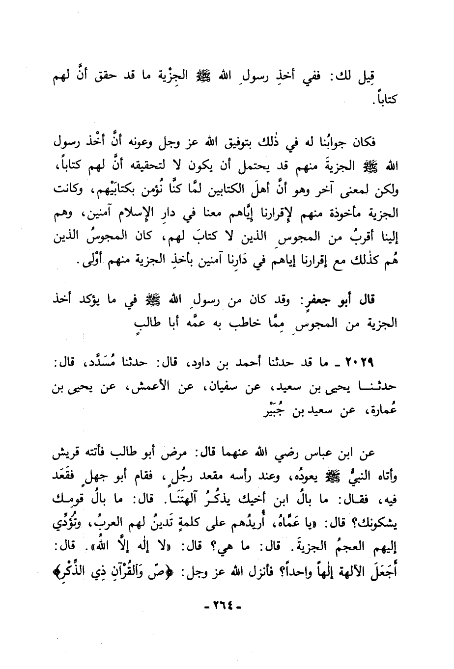 2029 - مَا قَدْ حَدَّثَنَا أَحْمَدُ بْنُ دَاوُدَ قَالَ: حَدَّثَنَا مُسَدَّدٌ قَالَ: حَدَّثَنَا يَحْيَى بْنُ سَعِيدٍ , عَنْ سُفْيَانَ , عَنِ الْأَعْمَشِ , عَنْ يَحْيَى بْنِ عُمَارَةَ , عَنْ سَعِيدِ بْنِ جُبَيْرٍ , عَنِ ابْنِ عَبَّاسٍ رَضِيَ اللهُ عَنْهُمَا قَالَ: مَرِضَ أَبُو طَالِبٍ فَأَتَتْهُ قُرَيْشٌ , وَأَتَاهُ النَّبِيُّ صَلَّى اللَّهُ عَلَيْهِ وَسَلَّمَ يَعُودُهُ , وَعِنْدَ رَأْسِهِ مَقْعَدُ رَجُلٍ , فَقَامَ أَبُو جَهْلٍ فَقَعَدَ فِيهِ , فَقَالَ: مَا بَالُ ابْنِ أَخِيكَ يَذْكُرُ آلِهَتَنَا؟ قَالَ: مَا بَالُ قَوْمِكَ يَشْكُونَكَ؟ قَالَ: " يَا عَمَّاهُ , أُرِيدُهُمْ عَلَى كَلِمَةٍ تَدِينُ لَهُمُ الْعَرَبُ وَتُؤَدِّي إِلَيْهِمْ الْعَجَمُ الْجِزْيَةَ " قَالَ: مَا هِيَ؟ قَالَ: " لَا إِلَهَ إِلَّا اللهُ " قَالَ: أَجَعَلَ الْآلِهَةَ إِلَهًا وَاحِدًا؟ فَأَنْزَلَ اللهُ عَزَّ وَجَلَّ: {ص وَالْقُرْآنِ ذِي الذِّكْرِ} [ص: 1]-[265]- إِلَى قَوْلِهِ: {إِنَّ هَذَا لَشَيْءٌ عُجَابٌ} [ص: 5] قَالَ أَبُو جَعْفَرٍ: فَكَانَ فِي هَذَا الْحَدِيثِ مَا قَدْ دَلَّ عَلَى دُخُولِ الْمَجُوسِ فِيمَنْ تُؤْخَذُ مِنْهُ الْجِزْيَةُ؛ لِأَنَّهُمْ مِنَ الْعَجَمِ فَقَالَ هَذَا الْقَائِلُ: وَكَيْفَ تَقْبَلُونَ هَذَا الْحَدِيثَ وَفِي إِسْنَادِهِ يَحْيَى بْنُ عُمَارَةَ وَأَنْتُمْ لَا تَعْرِفُونَهُ , وَلَا تَعْرِفُونَ يَحْيَى بْنَ عُمَارَةَ فِي أَهْلِ الْعِلْمِ إِلَّا يَحْيَى بْنَ عُمَارَةَ الْأَنْصَارِيَّ أَبَا عَمْرِو بْنَ يَحْيَى وَذَلِكَ لَا يَرْوِي عَنْ سَعِيدِ بْنِ جُبَيْرٍ وَإِنَّمَا هُوَ مِنْ أَهْلِ الْمَدِينَةِ؟ فَكَانَ جَوَابَنَا لَهُ فِي ذَلِكَ بِتَوْفِيقِ اللهِ عَزَّ وَجَلَّ وَعَوْنِهِ: أَنَّ يَحْيَى بْنَ -[266]- عُمَارَةَ الْمَذْكُورَ فِي هَذَا الْحَدِيثِ كَمَا ذَكَرَ , غَيْرَ أَنَّا قَدْ وَقَفْنَا عَلَى الْعِلَّةِ فِيهِ فَبَانَ لَنَا أَنَّهُ مُصَحَّفٌ , وَأَنَّهُ إِنَّمَا أُرِيدَ يَحْيَى بْنُ عَبَّادٍ أَبُو هُبَيْرَةَ الْأَنْصَارِيُّ وَهُوَ رَجُلٌ جَلِيلٌ مِنْ تَابِعِي الْكُوفَةِ فَصُحِّفَ فَقِيلَ: يَحْيَى بْنُ عُمَارَةَ.