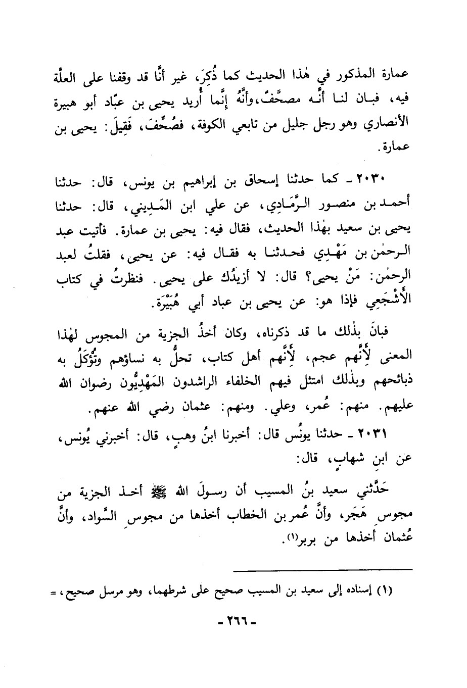 2031 - حَدَّثَنَا يُونُسُ قَالَ: أَخْبَرَنَا ابْنُ وَهْبٍ قَالَ: أَخْبَرَنِي يُونُسُ , عَنِ ابْنِ شِهَابٍ قَالَ: حَدَّثَنِي سَعِيدُ بْنُ الْمُسَيِّبِ: أَنَّ رَسُولَ اللهِ صَلَّى اللَّهُ عَلَيْهِ وَسَلَّمَ أَخَذَ الْجِزْيَةَ مِنْ مَجُوسِ هَجَرَ وَأَنَّ عُمَرَ بْنَ الْخَطَّابِ أَخَذَهَا مِنْ مَجُوسِ السَّوَادِ وَأَنَّ عُثْمَانَ أَخَذَهَا مِنْ بَرْبَرَ. -[267]- قَالَ أَبُو جَعْفَرٍ: وَكَذَلِكَ كَتَبَ الْحَسَنُ إِلَى عُمَرَ بْنِ عَبْدِ الْعَزِيزِ