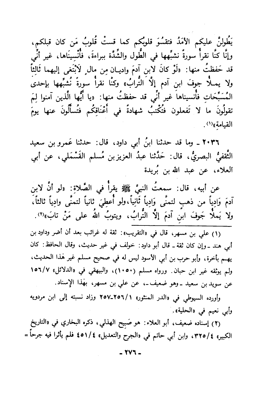 2036 - وَمَا قَدْ حَدَّثَنَا ابْنُ أَبِي دَاوُدَ قَالَ: حَدَّثَنَا عَمْرُو بْنُ سَعِيدٍ الثَّقَفِيُّ الْبَصْرِيُّ قَالَ: حَدَّثَنَا عَبْدُ الْعَزِيزِ بْنُ مُسْلِمٍ الْقَسْمَلِيُّ , عَنْ أَبِي الْعَلَاءِ , عَنْ عَبْدِ اللهِ بْنِ بُرَيْدَةَ , عَنْ أَبِيهِ قَالَ: سَمِعْتُ النَّبِيَّ صَلَّى اللَّهُ عَلَيْهِ وَسَلَّمَ يَقْرَأُ فِي الصَّلَاةِ: " لَوْ أَنَّ لِابْنِ آدَمَ وَادِيًا مِنْ ذَهَبٍ لَتَمَنَّى وَادِيًا ثَانِيًا , وَلَوْ أُعْطِيَ ثَانِيًا لَتَمَنَّى وَادِيًا ثَالِثًا , وَلَا يَمْلَأُ جَوْفَ ابْنِ آدَمَ إِلَّا التُّرَابُ وَيَتُوبُ اللهُ عَلَى مَنْ تَابَ "