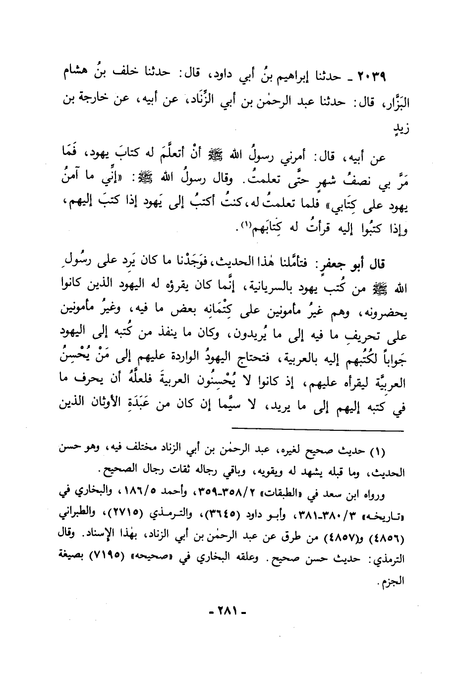 2039 - حَدَّثَنَا إِبْرَاهِيمُ بْنُ أَبِي دَاوُدَ قَالَ: حَدَّثَنَا خَلَفُ بْنُ هِشَامٍ الْبَزَّارُ قَالَ: حَدَّثَنَا عَبْدُ الرَّحْمَنِ بْنُ أَبِي الزِّنَادِ , عَنْ أَبِيهِ , عَنْ خَارِجَةَ بْنِ زَيْدٍ , عَنْ أَبِيهِ قَالَ: " " أَمَرَنِي رَسُولُ اللهِ صَلَّى اللَّهُ عَلَيْهِ وَسَلَّمَ أَنْ أَتَعَلَّمَ لَهُ كِتَابَ يَهُودَ " " فَمَا مَرَّ بِي نِصْفُ شَهْرٍ حَتَّى تَعَلَّمْتُ , وَقَالَ رَسُولُ اللهِ صَلَّى اللَّهُ عَلَيْهِ وَسَلَّمَ: " " إِنِّي مَا آمَنُ يَهُودَ عَلَى كِتَابِي " " فَلَمَّا تَعَلَّمْتُ لَهُ كُنْتُ أَكْتُبُ إِلَى يَهُودَ إِذَا كَتَبَ إِلَيْهِمْ , وَإِذَا كَتَبُوا إِلَيْهِ قَرَأْتُ لَهُ كِتَابَهُمْ. قَالَ أَبُو جَعْفَرٍ: فَتَأَمَّلْنَا هَذَا الْحَدِيثَ فَوَجَدْنَا مَا كَانَ يَرِدُ عَلَى رَسُولِ اللهِ صَلَّى اللَّهُ عَلَيْهِ وَسَلَّمَ مِنْ كُتُبِ يَهُودَ بِالسُّرْيَانِيَّةِ إِنَّمَا كَانَ يَقْرَؤُهُ لَهُ الْيَهُودُ الَّذِينَ كَانُوا يَحْضُرُونَهُ , وَهُمْ غَيْرُ مَأْمُونِينَ عَلَى كِتْمَانِهِ بَعْضَ مَا فِيهِ , وَغَيْرُ مَأْمُونِينَ عَلَى تَحْرِيفِ مَا فِيهِ إِلَى مَا يُرِيدُونَ , وَكَانَ مَا يَنْفُذُ مِنْ كُتُبِهِ إِلَى الْيَهُودِ جَوَابًا لِكُتُبِهِمْ لَهُ بِالْعَرَبِيَّةِ فَتَحْتَاجُ الْيَهُودُ الْوَارِدَةُ عَلَيْهِمْ إِلَى مَنْ يُحْسِنُ الْعَرَبِيَّةَ لِيَقْرَأَهُ عَلَيْهِمْ؛ إِذْ كَانُوا لَا يُحْسِنُونَ الْعَرَبِيَّةَ , فَلَعَلَّهُ أَنْ يُحَرِّفَ مَا فِي كُتُبِهِ إِلَيْهِمْ إِلَى مَا يُرِيدُ , لَا سِيَّمَا إِنْ كَانَ مِنْ عَبَدَةِ الْأَوْثَانِ الَّذِينَ -[282]- فِي قُلُوبِهِمْ عَلَى رَسُولِ اللهِ صَلَّى اللَّهُ عَلَيْهِ وَسَلَّمَ مَا لَا خَفَاءَ بِهِ , وَفِي قُلُوبِهِمْ عَلَى أَهْلِ الْكِتَابِ مَا فِيهَا , فَأَمَرَ رَسُولُ اللهِ صَلَّى اللَّهُ عَلَيْهِ وَسَلَّمَ زَيْدًا أَنْ يَتَعَلَّمَ لَهُ السُّرْيَانِيَّةَ لَيَقْرَأَ كُتُبَهُمْ إِذَا وَرَدَتْ عَلَيْهِ قِرَاءَةً , فَيَأْمَنَ بِهَا كِتْمَانَ مَا فِيهَا , وَيَأْمَنَ بِهَا تَحْرِيفَ مَا فِيهَا , وَيَكُونَ كِتَابُهُ صَلَّى اللَّهُ عَلَيْهِ وَسَلَّمَ إِذَا وَرَدَ عَلَى الْيَهُودِ وَرَدَ عَلَيْهِمْ كِتَابٌ يَقْرَؤُهُ عَامَّتُهُمْ , يَأْمَنُ فِيهِ مِنْ كِتْمَانِ بَعْضِ مَا فِيهِ , وَمِنْ تَحْرِيفِ مَا فِيهِ إِلَى غَيْرِ مَا كَتَبَ بِهِ , فَهَذَا وَجْهُ هَذَا الْحَدِيثِ عِنْدَنَا , وَاللهَ عَزَّ وَجَلَّ نَسْأَلُهُ التَّوْفِيقَ