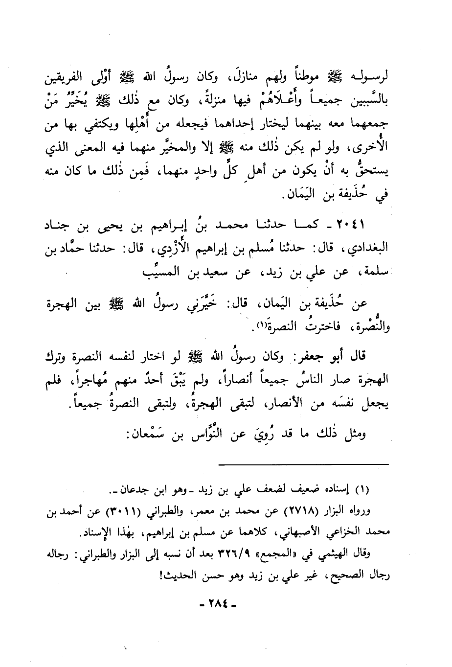 2041 - كَمَا حَدَّثَنَا مُحَمَّدُ بْنُ إِبْرَاهِيمَ بْنِ يَحْيَى بْنِ جَنَّادٍ الْبَغْدَادِيُّ قَالَ: حَدَّثَنَا مُسْلِمُ بْنُ إِبْرَاهِيمَ الْأَزْدِيُّ قَالَ: حَدَّثَنَا حَمَّادُ بْنُ سَلَمَةَ , عَنْ عَلِيِّ بْنِ زَيْدٍ , عَنْ سَعِيدِ بْنِ الْمُسَيِّبِ , عَنْ حُذَيْفَةَ بْنِ الْيَمَانِ قَالَ: " خَيَّرَنِي رَسُولُ اللهِ صَلَّى اللَّهُ عَلَيْهِ وَسَلَّمَ بَيْنَ الْهِجْرَةِ وَالنُّصْرَةِ فَاخْتَرْتُ النُّصْرَةَ ". قَالَ أَبُو جَعْفَرٍ: وَكَانَ رَسُولُ اللهِ صَلَّى اللَّهُ عَلَيْهِ وَسَلَّمَ لَوِ اخْتَارَ لِنَفْسِهِ النُّصْرَةَ وَتَرَكَ الْهِجْرَةَ صَارَ النَّاسُ جَمِيعًا أَنْصَارًا , وَلَمْ يَبْقَ أَحَدٌ مِنْهُمْ مُهَاجِرًا , فَلَمْ يَجْعَلْ نَفْسَهُ مِنَ الْأَنْصَارِ لِتَبْقَى الْهِجْرَةُ وَلِتَبْقَى النُّصْرَةُ جَمِيعًا وَمِثْلُ ذَلِكَ مَا قَدْ رُوِيَ عَنِ النَّوَّاسِ بْنِ سَمْعَانَ