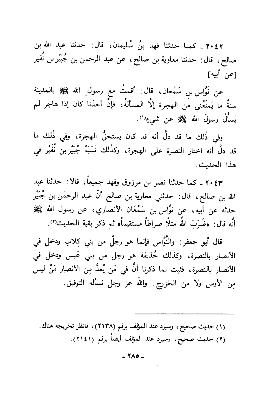2043 - كَمَا حَدَّثَنَا نَصْرُ بْنُ مَرْزُوقٍ , وَفَهْدٌ , جَمِيعًا قَالَا: حَدَّثَنَا عَبْدُ اللهِ بْنُ صَالِحٍ قَالَ: حَدَّثَنِي مُعَاوِيَةُ بْنُ صَالِحٍ , أَنَّ عَبْدَ الرَّحْمَنِ بْنَ جُبَيْرٍ , حَدَّثَهُ , عَنْ أَبِيهِ , عَنْ نَوَّاسِ بْنِ سَمْعَانَ الْأَنْصَارِيِّ , عَنْ رَسُولِ اللهِ صَلَّى اللَّهُ عَلَيْهِ وَسَلَّمَ أَنَّهُ قَالَ: " ضَرَبَ اللهُ مَثَلًا صِرَاطًا مُسْتَقِيمًا " ثُمَّ ذَكَرَ بَقِيَّةَ الْحَدِيثِ. قَالَ أَبُو جَعْفَرٍ: وَالنَّوَّاسُ فَإِنَّمَا هُوَ رَجُلٌ مِنْ بَنِي كِلَابٍ وَدَخَلَ فِي الْأَنْصَارِ بِالنُّصْرَةِ , وَكَذَلِكَ حُذَيْفَةُ هُوَ رَجُلٌ مِنْ بَنِي عَبْسٍ وَدَخَلَ فِي الْأَنْصَارِ بِالنُّصْرَةِ. فَثَبَتَ بِمَا ذَكَرْنَا أَنَّ فِي مَنْ يُعَدُّ مِنَ الْأَنْصَارِ مَنْ لَيْسَ مِنَ الْأَوْسِ وَلَا مِنَ الْخَزْرَجِ , وَاللهَ عَزَّ وَجَلَّ نَسْأَلُهُ التَّوْفِيقَ