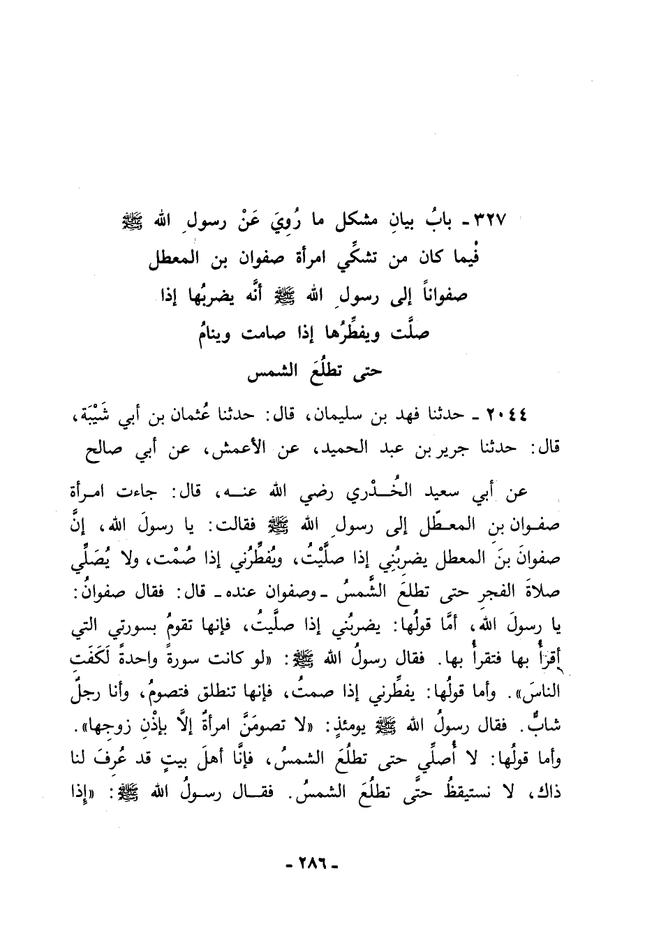 2044 - حَدَّثَنَا فَهْدُ بْنُ سُلَيْمَانَ قَالَ: حَدَّثَنَا عُثْمَانُ بْنُ أَبِي شَيْبَةَ قَالَ: حَدَّثَنَا جَرِيرُ بْنُ عَبْدِ الْحَمِيدِ , عَنِ الْأَعْمَشِ , عَنْ أَبِي صَالِحٍ , عَنْ أَبِي سَعِيدٍ الْخُدْرِيِّ , رَضِيَ اللهُ عَنْهُ قَالَ: جَاءَتِ امْرَأَةُ صَفْوَانَ بْنِ الْمُعَطَّلِ إِلَى رَسُولِ اللهِ صَلَّى اللَّهُ عَلَيْهِ وَسَلَّمَ فَقَالَتْ: يَا رَسُولَ اللهِ , إِنَّ صَفْوَانَ بْنَ الْمُعَطَّلِ يَضْرِبُنِي إِذَا صَلَّيْتُ , وَيُفَطِّرُنِي إِذَا صُمْتُ , وَلَا يُصَلِّي صَلَاةَ الْفَجْرِ حَتَّى تَطْلُعَ الشَّمْسُ , وَصَفْوَانُ عِنْدَهُ , قَالَ: فَقَالَ صَفْوَانُ: يَا رَسُولَ اللهِ , أَمَّا قَوْلُهَا: يَضْرِبُنِي إِذَا صَلَّيْتُ , فَإِنَّهَا تَقُومُ بِسُورَتِي الَّتِي أَقْرَأُ بِهَا , فَتَقْرَأُ بِهَا. فَقَالَ رَسُولُ اللهِ صَلَّى اللَّهُ عَلَيْهِ وَسَلَّمَ: " لَوْ كَانَتْ سُورَةً وَاحِدَةً لَكَفَتِ النَّاسَ ". وَأَمَّا قَوْلُهَا: يُفَطِّرُنِي إِذَا صُمْتُ , فَإِنَّهَا تَنْطَلِقُ فَتَصُومُ , وَأَنَا رَجُلٌ شَابٌّ. فَقَالَ رَسُولُ اللهِ صَلَّى اللَّهُ عَلَيْهِ وَسَلَّمَ يَوْمَئِذٍ: " لَا تَصُومَنَّ امْرَأَةٌ إِلَّا بِإِذْنِ زَوْجِهَا " وَأَمَّا قَوْلُهَا: لَا أُصَلِّي حَتَّى تَطْلُعَ الشَّمْسُ , فَإِنَّا أَهْلُ بَيْتٍ قَدْ عُرِفَ لَنَا ذَاكَ , لَا نَسْتَيْقِظُ حَتَّى تَطْلُعَ الشَّمْسُ. فَقَالَ رَسُولُ اللهِ صَلَّى اللَّهُ عَلَيْهِ وَسَلَّمَ: " إِذَا -[287]- اسْتَيْقَظْتَ فَصَلِّ ". قَالَ أَبُو جَعْفَرٍ: فَتَأَمَّلْنَا مَا فِي هَذَا الْحَدِيثِ مِنْ تَشَكِّي امْرَأَةِ صَفْوَانَ , صَفْوَانَ أَنَّهُ يَضْرِبُهَا إِذَا صَلَّتْ , وَإِخْبَارِ صَفْوَانَ رَسُولَ اللهِ صَلَّى اللَّهُ عَلَيْهِ وَسَلَّمَ أَنَّهُ إِنَّمَا يَفْعَلُ ذَلِكَ بِهَا؛ لِأَنَّهَا تَقُومُ بِسُورَتِهِ الَّتِي يَقْرَأُ بِهَا , وَقَوْلِ رَسُولِ اللهِ صَلَّى اللَّهُ عَلَيْهِ وَسَلَّمَ لَهُ فِي ذَلِكَ: " لَوْ كَانَتْ سُورَةً وَاحِدَةً لَكَفَتِ النَّاسَ " فَوَجَدْنَا ذَلِكَ مُحْتَمِلًا أَنْ يَكُونَ ظَنَّ أَنَّهَا إِذَا قَرَأَتْ سُورَتَهُ الَّتِي يَقُومُ بِهَا أَنَّهُ لَا يَحْصُلُ لَهُمَا -[288]- بِقِرَاءَتِهِمَا إِيَّاهَا جَمِيعًا إِلَّا ثَوَابًا وَاحِدًا , مُلْتَمِسًا أَنْ تَكُونَ تَقْرَأُ غَيْرَ مَا يَقْرَأُ , فَيَحْصُلَ لَهُمَا ثَوَابَانِ , فَأَعْلَمَهُ رَسُولُ اللهِ صَلَّى اللَّهُ عَلَيْهِ وَسَلَّمَ أَنَّ ذَلِكَ يَحْصُلُ لَهُمَا بِهِ ثَوَابَانِ؛ لِأَنَّ قِرَاءَةَ كُلِّ وَاحِدٍ مِنْهُمَا إِيَّاهَا غَيْرُ قِرَاءَةِ الْآخَرِ إِيَّاهَا. وَتَأَمَّلْنَا قَوْلَهَا لَهُ صَلَّى اللَّهُ عَلَيْهِ وَسَلَّمَ: إِنَّهُ يَمْنَعُنِي مِنَ الصِّيَامِ وَمَا اعْتَذَرَ بِهِ صَفْوَانُ لَهُ عِنْدَ ذَلِكَ , وَنَهْيَهُ صَلَّى اللَّهُ عَلَيْهِ وَسَلَّمَ أَنْ تَصُومَ امْرَأَةٌ إِلَّا بِإِذْنِ زَوْجِهَا. فَعَقَلْنَا بِذَلِكَ أَنَّهُ إِنَّمَا كَانَ لِمَنْعِهَا إِيَّاهُ مِنْ نَفْسِهَا بِصَوْمِهَا , وَدَلَّ ذَلِكَ أَنَّهُ إِذَا كَانَ لَا حَاجَةَ بِهِ إِلَيْهَا لِغَيْبَتِهِ عَنْهَا , أَوْ بِمَا سِوَى ذَلِكَ مِمَّا يَقْطَعُهُ عَنْهَا , أَنَّهُ لَا بَأْسَ عَلَيْهَا أَنْ تَصُومَ , وَإِنْ لَمْ يَأْذَنْ لَهَا فِي ذَلِكَ , وَقَدْ وَجَدْنَا هَذَا الْمَعْنَى مَكْشُوفًا فِي حَدِيثٍ آخَرَ