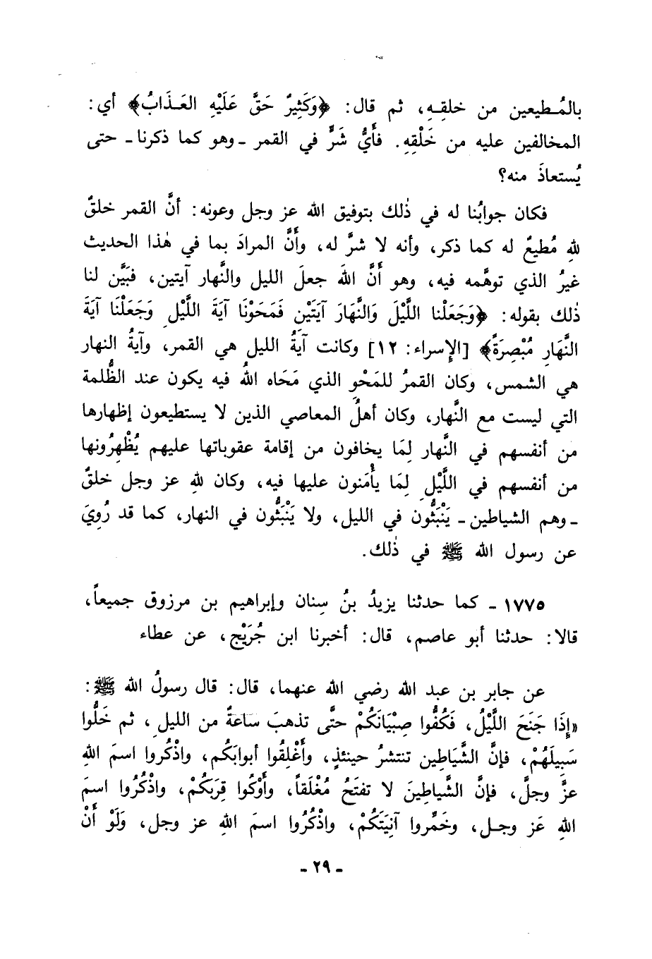 1775 - كَمَا حَدَّثَنَا يَزِيدُ بْنُ سِنَانٍ , وَإِبْرَاهِيمُ بْنُ مَرْزُوقٍ , جَمِيعًا قَالَا حَدَّثَنَا أَبُو عَاصِمٍ قَالَ: أَخْبَرَنَا ابْنُ جُرَيْجٍ , عَنْ عَطَاءٍ , عَنْ جَابِرِ بْنِ عَبْدِ اللهِ رَضِيَ اللهُ عَنْهُمَا قَالَ: قَالَ رَسُولُ اللهِ صَلَّى اللَّهُ عَلَيْهِ وَسَلَّمَ: " إِذَا جَنَحَ اللَّيْلُ فَكُفُّوا صِبْيَانَكُمْ حَتَّى تَذْهَبَ سَاعَةٌ مِنَ اللَّيْلِ , ثُمَّ خَلُّوا سَبِيلَهُمْ , فَإِنَّ الشَّيَاطِينَ تَنْتَشِرُ حِينَئِذٍ , وَأَغْلِقُوا أَبْوَابَكُمْ وَاذْكُرُوا اسْمَ اللهِ عَزَّ وَجَلَّ , فَإِنَّ الشَّيْاطِينَ لَا تَفْتَحُ مُغْلَقًا وَأَوْكُوا قِرَبَكُمْ وَاذْكُرُوا اسْمَ اللهِ عَزَّ وَجَلَّ , وَخَمِّرُوا آنِيَتَكُمْ وَاذْكُرُوا اسْمَ اللهِ عَزَّ وَجَلَّ , وَلَوْ أَنْ -[30]- تَعْرِضُوا عَلَيْهِ بِعُودٍ ". قَالَ: وَأَخْبَرَنِي عَمْرٌو , عَنْ جَابِرٍ بِنَحْوٍ مِنْ هَذَا , وَلَمْ يَذْكُرِ: اذْكُرُوا اسْمَ اللهِ عَزَّ وَجَلَّ