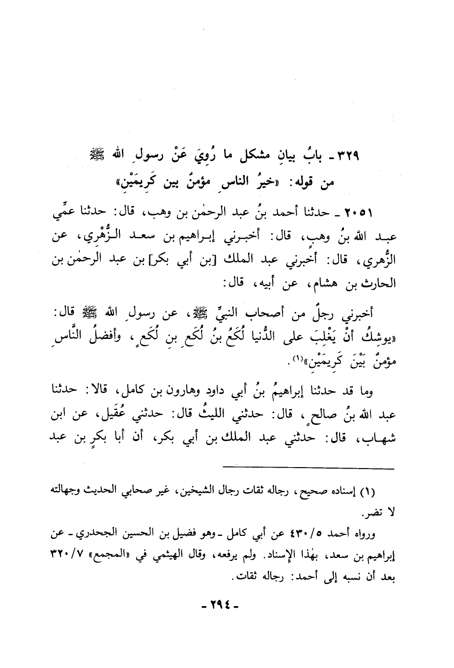 2051 - حَدَّثَنَا أَحْمَدُ بْنُ عَبْدِ الرَّحْمَنِ بْنِ وَهْبٍ قَالَ: حَدَّثَنَا عَمِّي عَبْدُ اللهِ بْنُ وَهْبٍ قَالَ: أَخْبَرَنِي إِبْرَاهِيمُ بْنُ سَعْدٍ الزُّهْرِيُّ , عَنِ الزُّهْرِيِّ قَالَ: أَخْبَرَنِي عَبْدُ الْمَلِكِ بْنُ أَبِي بَكْرِ بْنُ عَبْدِ الرَّحْمَنِ بْنِ الْحَارِثِ بْنِ هِشَامٍ , عَنْ أَبِيهِ قَالَ: أَخْبَرَنِي رَجُلٌ , مِنْ أَصْحَابِ النَّبِيِّ صَلَّى اللَّهُ عَلَيْهِ وَسَلَّمَ , عَنْ رَسُولِ اللهِ صَلَّى اللَّهُ عَلَيْهِ وَسَلَّمَ قَالَ: " يُوشِكُ أَنْ يَغْلِبَ عَلَى الدُّنْيَا لُكَعُ بْنُ لُكَعِ بْنِ لُكَعٍ , وَأَفْضَلُ النَّاسِ مُؤْمِنٌ بَيْنَ كَرِيمَيْنِ ". وَمَا قَدْ حَدَّثَنَا إِبْرَاهِيمُ بْنُ أَبِي دَاوُدَ , وَهَارُونُ بْنُ كَامِلٍ قَالَا: حَدَّثَنَا عَبْدُ اللهِ بْنُ صَالِحٍ قَالَ: حَدَّثَنِي اللَّيْثُ قَالَ: حَدَّثَنِي عُقَيْلٌ , عَنِ ابْنِ شِهَابٍ قَالَ: أَخْبَرَنِي عَبْدُ الْمَلِكِ بْنُ أَبِي بَكْرٍ أَنَّ أَبَا بَكْرِ بْنَ عَبْدِ -[295]- الرَّحْمَنِ أَخْبَرَهُ , أَنَّ بَعْضَ أَصْحَابِ رَسُولِ اللهِ صَلَّى اللَّهُ عَلَيْهِ وَسَلَّمَ قَالَ , ثُمَّ ذَكَرَ مِثْلَهُ وَلَمْ يَرْفَعْهُ. فَتَأَمَّلْنَا هَذَا الْحَدِيثَ فَوَجَدْنَا قَوْلَهُ صَلَّى اللَّهُ عَلَيْهِ وَسَلَّمَ: " يُوشِكُ أَنْ يَغْلِبَ عَلَى الدُّنْيَا لُكَعُ بْنُ لُكَعٍ " لَا اخْتِلَافَ فِي تَأْوِيلِهِ عِنْدَ الْعَرَبِ أَنَّهُ الْعَبْدُ أَوِ اللَّئِيمُ , وَتَأَمَّلْنَا قَوْلَهُ صَلَّى اللَّهُ عَلَيْهِ وَسَلَّمَ: " وَأَفْضَلُ النَّاسِ مُؤْمِنٌ بَيْنَ كَرِيمَيْنِ " فَأَحْسَنُ مَا حَضَرَنَا فِيهِ أَنْ يَكُونَ الْمُرَادُ بِهِ مُؤْمِنٌ بَيْنَ كَرِيمَيْنِ , أَيْ: مُؤْمِنٌ بَيْنَ أَبٍ مُؤْمِنٍ هُوَ أَصْلُهُ , وَابْنٍ مُؤْمِنٍ هُوَ فَرْعُهُ , فَيَكُونُ لَهُ مِنَ الْإِيمَانِ مَوْضِعُهُ مِنْهُ بِإِيمَانِ نَفْسِهِ , وَلَهُ مَوْضِعُهُ مِنْهُ بِإِيمَانِ ابْنِهِ الَّذِي كَانَ دُونَهُ رَفَعَهُ اللهُ عَزَّ وَجَلَّ إِلَى مَنْزِلَتِهِ , لِيُقِرَّ بِهِ عَيْنَهُ كَمِثْلِ مَا قَدْ رَوَيْنَا عَنْ عَبْدِ اللهِ بْنِ عَبَّاسٍ رَضِيَ اللهُ عَنْهُمَا , وَمِمَّا قَدْ رَفَعَهُ بَعْضُهُمْ عَنْهُ إِلَى النَّبِيِّ صَلَّى اللَّهُ عَلَيْهِ وَسَلَّمَ , فِيمَا تَقَدَّمَ مِنْ كِتَابِنَا هَذَا: " إِنَّ اللهَ لَيَرْفَعُ ذُرِّيَّةَ الْمُؤْمِنِ إِلَى مَنْزِلَتِهِ وَإِنْ كَانُوا دُونَهُ فِي الْعَمَلِ , وَقَرَأَ: {وَالَّذِينَ آمَنُوا وَاتَّبَعَتْهُمْ ذُرِّيَّتُهُمْ بِإِيمَانٍ أَلْحَقْنَا بِهِمْ ذُرِّيَّتَهُمْ} [الطور: 21] " وَيَكُونُ لَهُ مَوْضِعُهُ أَيْضًا بِإِيمَانِ أَبِيهِ. وَمِنْ ذَلِكَ مَا قَدْ رَوَيْنَاهُ فِيمَا تَقَدَّمَ مِنَّا فِي كِتَابِنَا هَذَا عَنِ النَّبِيِّ صَلَّى اللَّهُ عَلَيْهِ وَسَلَّمَ: " إِذَا مَاتَ الرَّجُلُ فَقَدِ انْقَطَعَ عَمَلُهُ إِلَّا مِنْ ثَلَاثَةٍ: مِنْ وَلَدٍ صَالِحٍ يَدْعُو لَهُ , أَوْ مِنْ عِلْمٍ بَثَّهُ , أَوْ مِنْ صَدَقَةٍ جَارِيَةٍ " وَمَنْ جَمَعَ هَذِهِ الثَّلَاثَةَ أَشْيَاءَ فَقَدْ جَمَعَ مَا عَسَى أَنْ يَكُونَ قَدِ اجْتَمَعَ لَهُ بِهِ خَيْرُ -[296]- الدُّنْيَا وَخَيْرُ الْآخِرَةِ , وَإِنَّمَا اخْتَرْنَا فِي هَذَا تَأْوِيلَ الْكَرَمِ أَنَّهُ التَّقْوَى؛ لِأَنَّ اللهَ تَعَالَى قَدْ قَالَ فِي كِتَابِهِ: {إِنَّ أَكْرَمَكُمْ عِنْدَ اللهِ أَتْقَاكُمْ} [الحجرات: 13] ؛ وَلِأَنَّ النَّبِيَّ صَلَّى اللَّهُ عَلَيْهِ وَسَلَّمَ قَدْ قَالَ