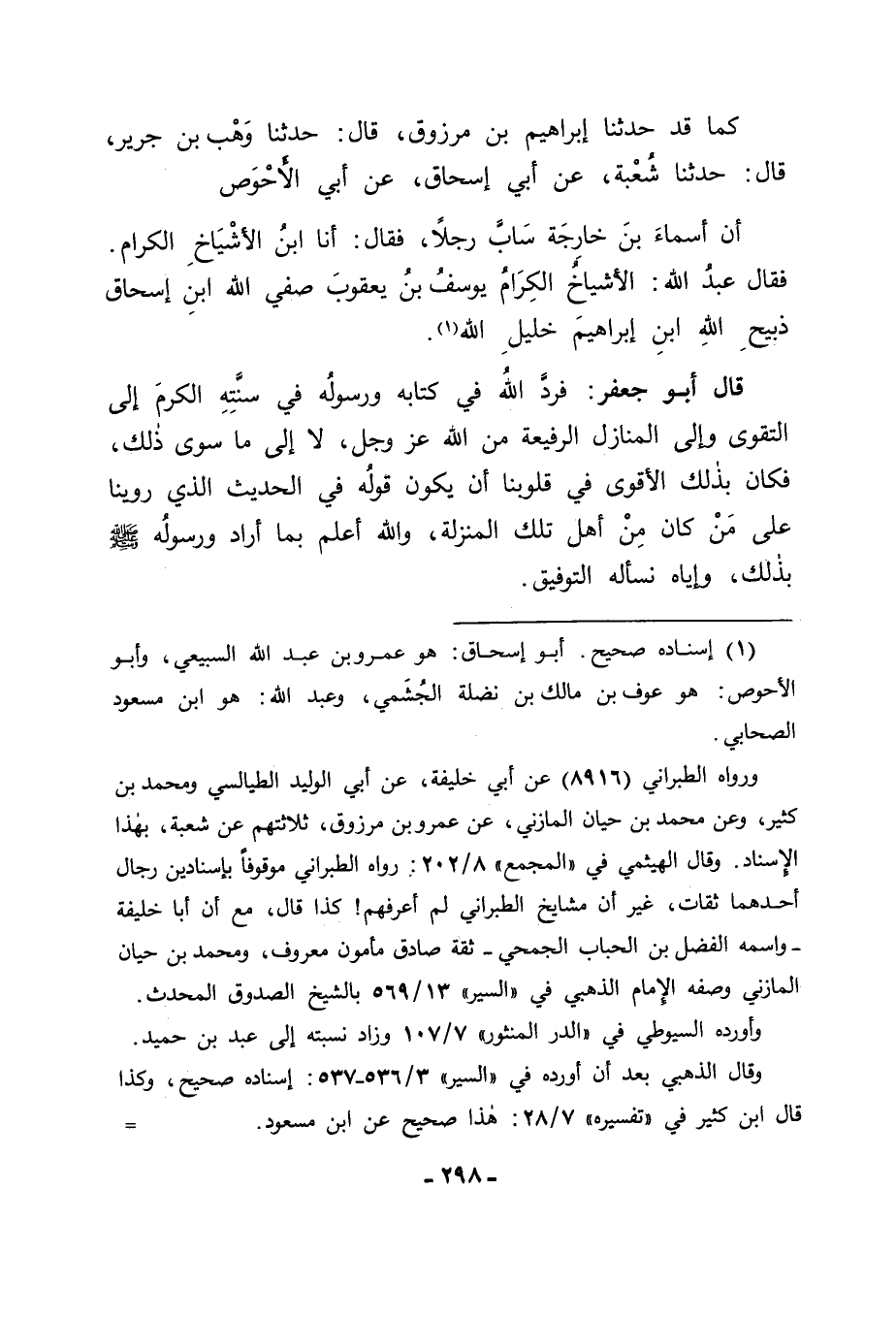 كَمَا قَدْ حَدَّثَنَا إِبْرَاهِيمُ بْنُ مَرْزُوقٍ قَالَ: حَدَّثَنَا وَهْبُ بْنُ جَرِيرٍ قَالَ: حَدَّثَنَا شُعْبَةُ , عَنْ أَبِي إِسْحَاقَ , عَنْ أَبِي الْأَحْوَصِ , أَنَّ أَسْمَاءَ بْنَ خَارِجَةَ سَابَّ رَجُلًا , فَقَالَ: أَنَا ابْنُ الْأَشْيَاخِ الْكِرَامِ , فَقَالَ عَبْدُ اللهِ: الْأَشْيَاخُ الْكِرَامُ يُوسُفُ بْنُ يَعْقُوبَ صَفِيِّ اللهِ ابْنِ إِسْحَاقَ ذَبِيحِ اللهِ ابْنِ إِبْرَاهِيمَ خَلِيلِ اللهِ. قَالَ أَبُو جَعْفَرٍ: فَرَدَّ اللهُ فِي كِتَابِهِ , وَرَسُولُهُ فِي سُنَّتِهِ الْكَرَمَ إِلَى التَّقْوَى , وَإِلَى الْمَنَازِلِ الرَّفِيعَةِ مِنَ اللهِ عَزَّ وَجَلَّ لَا إِلَى مَا سِوَى ذَلِكَ , فَكَانَ بِذَلِكَ الْأَقْوَى فِي قُلُوبِنَا أَنْ يَكُونَ قَوْلُهُ فِي الْحَدِيثِ الَّذِي رَوَيْنَا عَلَى مَنْ كَانَ مِنْ أَهْلِ تِلْكَ الْمَنْزِلَةِ , وَاللهُ أَعْلَمُ بِمَا أَرَادَ وَرَسُولُهُ صَلَّى اللَّهُ عَلَيْهِ وَسَلَّمَ بِذَلِكَ , وَإِيَّاهُ نَسْأَلُهُ التَّوْفِيقَ