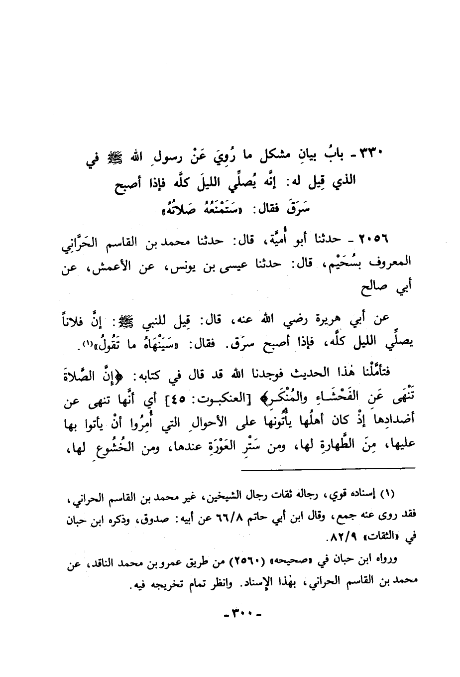 2056 - حَدَّثَنَا أَبُو أُمَيَّةَ قَالَ: حَدَّثَنَا مُحَمَّدُ بْنُ الْقَاسِمِ الْحَرَّانِيُّ الْمَعْرُوفُ بِسُحَيْمٍ قَالَ: حَدَّثَنَا عِيسَى بْنُ يُونُسَ , عَنِ الْأَعْمَشِ , عَنْ أَبِي صَالِحٍ , عَنْ أَبِي هُرَيْرَةَ رَضِيَ اللهُ عَنْهُ قَالَ: قِيلَ لِلنَّبِيِّ صَلَّى اللَّهُ عَلَيْهِ وَسَلَّمَ: إِنَّ فُلَانًا يُصَلِّي اللَّيْلَ كُلَّهُ , فَإِذَا أَصْبَحَ سَرَقَ. فَقَالَ: " سَيَنْهَاهُ مَا تَقُولُ ". فَتَأَمَّلْنَا هَذَا الْحَدِيثَ فَوَجَدْنَا اللهَ قَدْ قَالَ فِي كِتَابِهِ: {إِنَّ الصَّلَاةَ تَنْهَى عَنِ الْفَحْشَاءِ وَالْمُنْكَرِ} [العنكبوت: 45] أَيْ: أَنَّهَا تَنْهَى عَنْ أَضْدَادِهَا إِذْ كَانَ أَهْلُهَا يَأْتُونَهَا عَلَى الْأَحْوَالِ الَّتِي أُمِرُوا أَنْ يَأْتُوا بِهَا عَلَيْهَا , مِنَ الطَّهَارَةِ لَهَا , وَمِنْ سَتْرِ الْعَوْرَةِ عِنْدَهَا , وَمِنَ الْخُشُوعِ لَهَا , -[301]- وَتَوْفِيَتِهَا مَا يَجِبُ أَنْ تُوَفَّاهُ , وَكَانَ اللهُ عَزَّ وَجَلَّ قَدْ وَعَدَ أَهْلَهَا بِمَا فِي الْآيَةِ الَّتِي تَلَوْنَا , فَكَانَتِ السَّرِقَةُ ضِدًّا لَهَا , وَهِيَ تَنْهَى عَنْ أَضْدَادِهَا , وَيَرُدُّ اللهُ عَزَّ وَجَلَّ أَهْلَهَا إِلَيْهَا , وَيَنْفِي عَنْهُمْ أَضْدَادَهَا حَتَّى يُوَفِّيَهُمْ ثَوَابَهَا , وَحَتَّى يُنْزِلَهُمُ الْمَنْزِلَةَ الَّتِي يُنْزِلُهَا أَهْلَهَا. وَفِي ذَلِكَ مَا يَدُلُّ عَلَى أَنَّهُ عَزَّ وَجَلَّ بِمَنِّهِ وَلُطْفِهِ وَسِعَةِ رَحْمَتِهِ يُبَرِّئُ ذَلِكَ السَّارِقَ مِمَّا كَانَ سَرَقَ , وَيَرُدُّهُ إِلَى أَهْلِهِ حَتَّى يَلْقَاهُ يَوْمَ يَلْقَاهُ , لَا تَبِعَةَ قَبْلَهُ تَمْنَعُهُ مِنْ دُخُولِ جَنَّتِهِ بِمَنِّهِ وَقُدْرَتِهِ , وَاللهَ نَسْأَلُهُ التَّوْفِيقَ , وَأَنْ يَجْعَلَنَا وَإِيَّاكُمْ مِنْ أَهْلِ الْمَنْزِلَةِ الَّتِي أَنْزَلَهَا أَهْلَ الصَّلَاةِ الْمَقْبُولَةِ , وَصَلَّى الله عَلَى مُحَمَّدٍ النبي وَعَلَى آلِهِ وَسَلَّمَ تَسْلِيمًا كَثِيرًا.